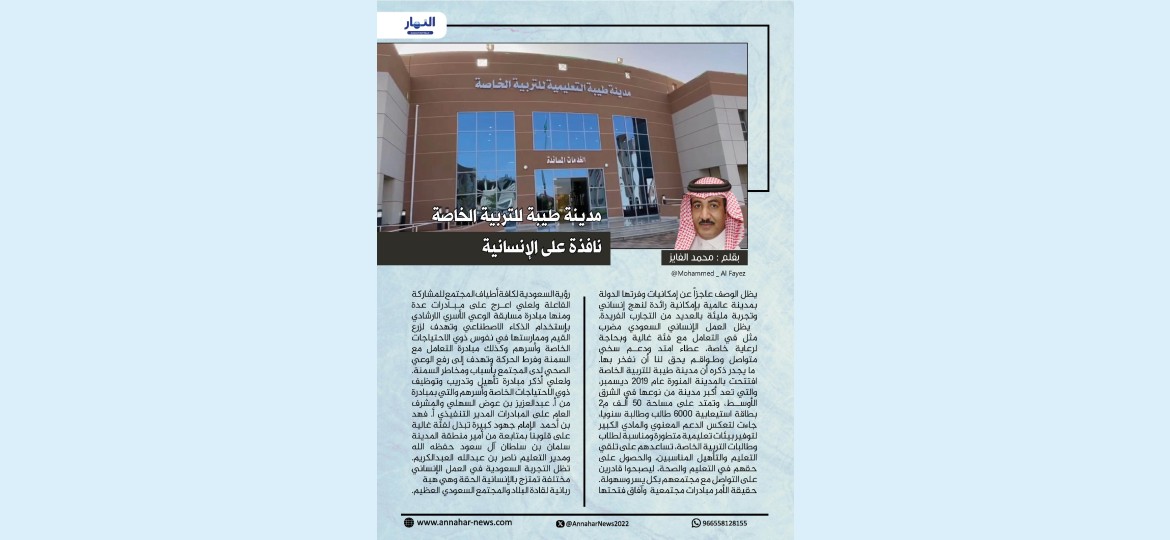 ما يجدر ذكره أن مدينة طيبة للتربية الخاصة افتتحت بالمدينة المنورة عام 2019 ديسمبر، والتي تعد أكبر مدينة من نوعها في الشرق الأوسط، وتمتد على مساحة 50 ألف م2 بطاقة استيعابية 6000 طالب وطالبة سنويا، جاءت لتعكس الدعم المعنوي والمادي الكبير لتوفير بيئات تعليمية متطورة ومناسبة لطلاب وطالبات التربية الخاصة، تساعدهم على تلقي التعليم والتأهيل المناسبين، والحصول على حقهم في التعليم والصحة، ليصبحوا قادرين على التواصل مع مجتمعهم بكل يسر وسهولة.