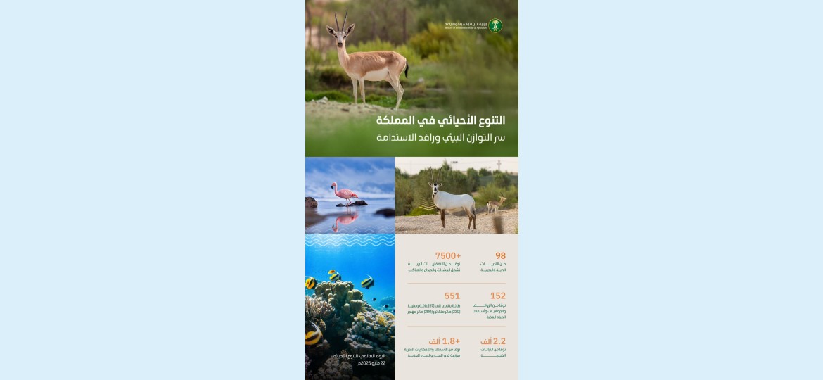 ويحتفل العالم في الثاني والعشرين من شهر مايو في كل عام، بمناسبة "اليوم الدولي للتنوع البيولوجي"، ويأتي الاحتفال هذا العام تحت شعار:" الانسجام مع الطبيعة والتنمية المستدامة"؛ للتأكيد على أهمية حفظ التنوع البيولوجي، وضرورة بناء توازنٍ فعّال بين الإنسان والطبيعة؛ لضمان مستقبل مستدام.