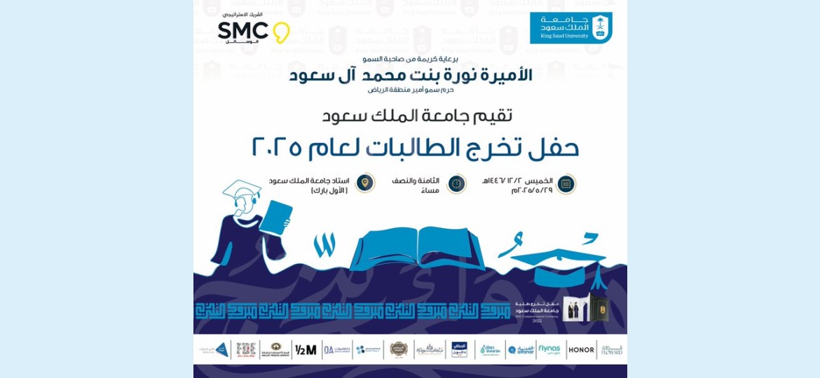 الرياض – تحت رعاية صاحبة السمو الأميرة نورة بنت محمد آل سعود، حرم سمو أمير منطقة الرياض، تقيم جامعة الملك سعود حفل تخرج طالباتها للعام الجامعي 2025، وذلك مساء يوم الخميس الموافق 2 ذو الحجة 1447هـ (29 مايو 2025م) عند الساعة 8:30 مساءً، في استاد جامعة الملك سعود (الأول بارك).