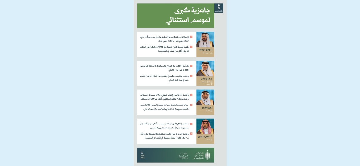 كشفت الجهات الحكومية السعودية عن استعدادات شاملة لموسم حج هذا العام، وذلك خلال المؤتمر الصحفي الحكومي المنعقد في 26 مايو 2025.