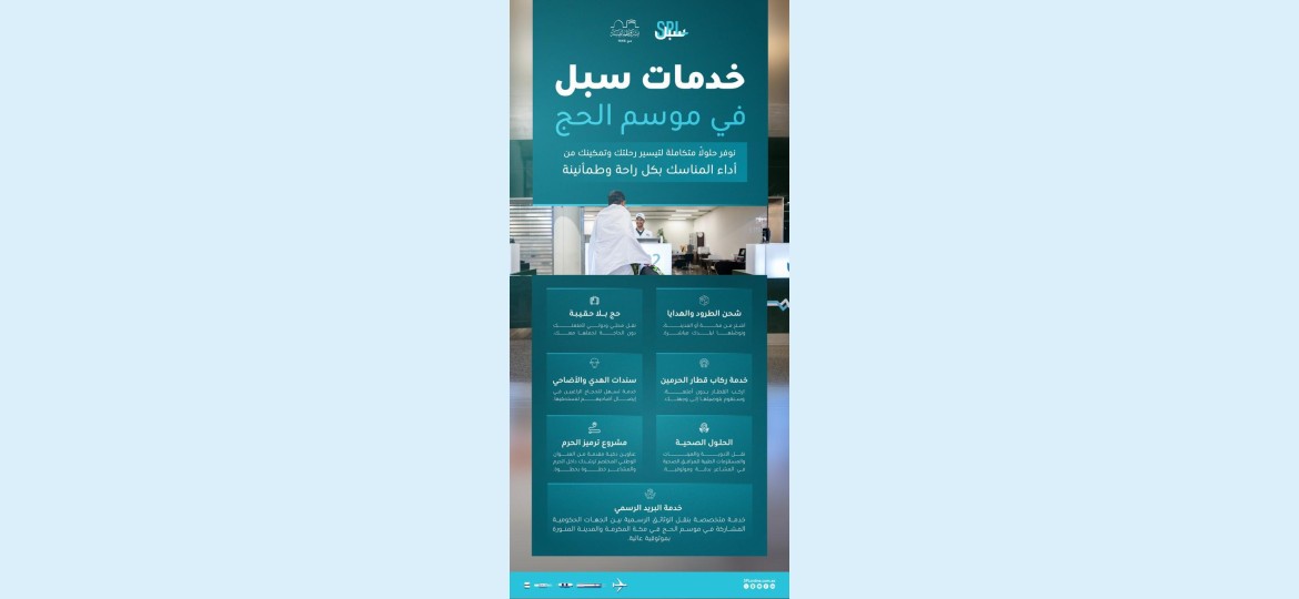وتُعد خدمة "حج بلا حقيبة" إحدى أبرز خدمات " سبل"، حيث تتيح نقل أمتعة الحجاج محليًا ودوليًا دون الحاجة لحملها أثناء تنقلهم بين المشاعر، مما يسهم في تخفيف الأعباء اللوجستية، ويمنحهم تجربة حج أكثر راحة وسلاسة. وتتكامل هذه التجربة مع خدمة ركاب قطار الحرمين التي تتيح للحجاج التنقل بسلاسة بين مكة المكرمة والمدينة المنورة والمشاعر المقدسة، دون انشغال بحمل الأمتعة، مع ضمان استلامها في الوقت والمكان المناسبين، بما يعزز كفاءة الحركة ويرتقي بجودة رحلة الحاج.