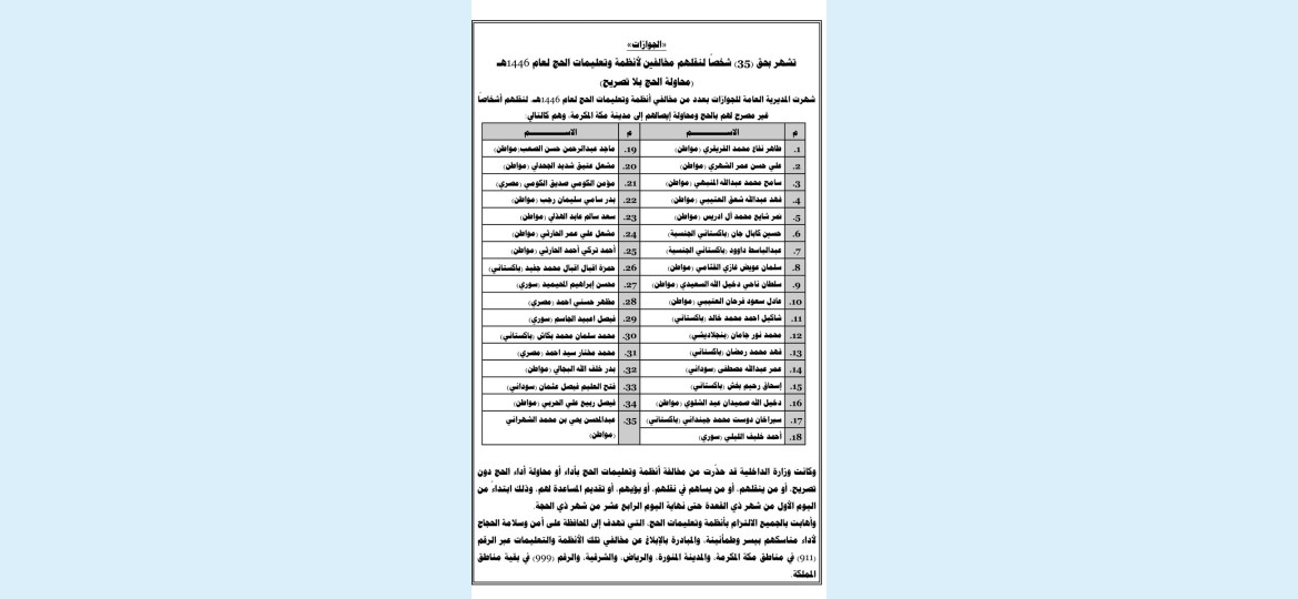 شهرت المديرية العامة للجوازات بعدد من مخالفي أنظمة وتعليمات الحج لعام 1446هـ، لنقلهم أشخاصًا غير مصرح لهم بالحج ومحاولة إيصالهم إلى مدينة مكة المكرمة، وهم كالتالي: