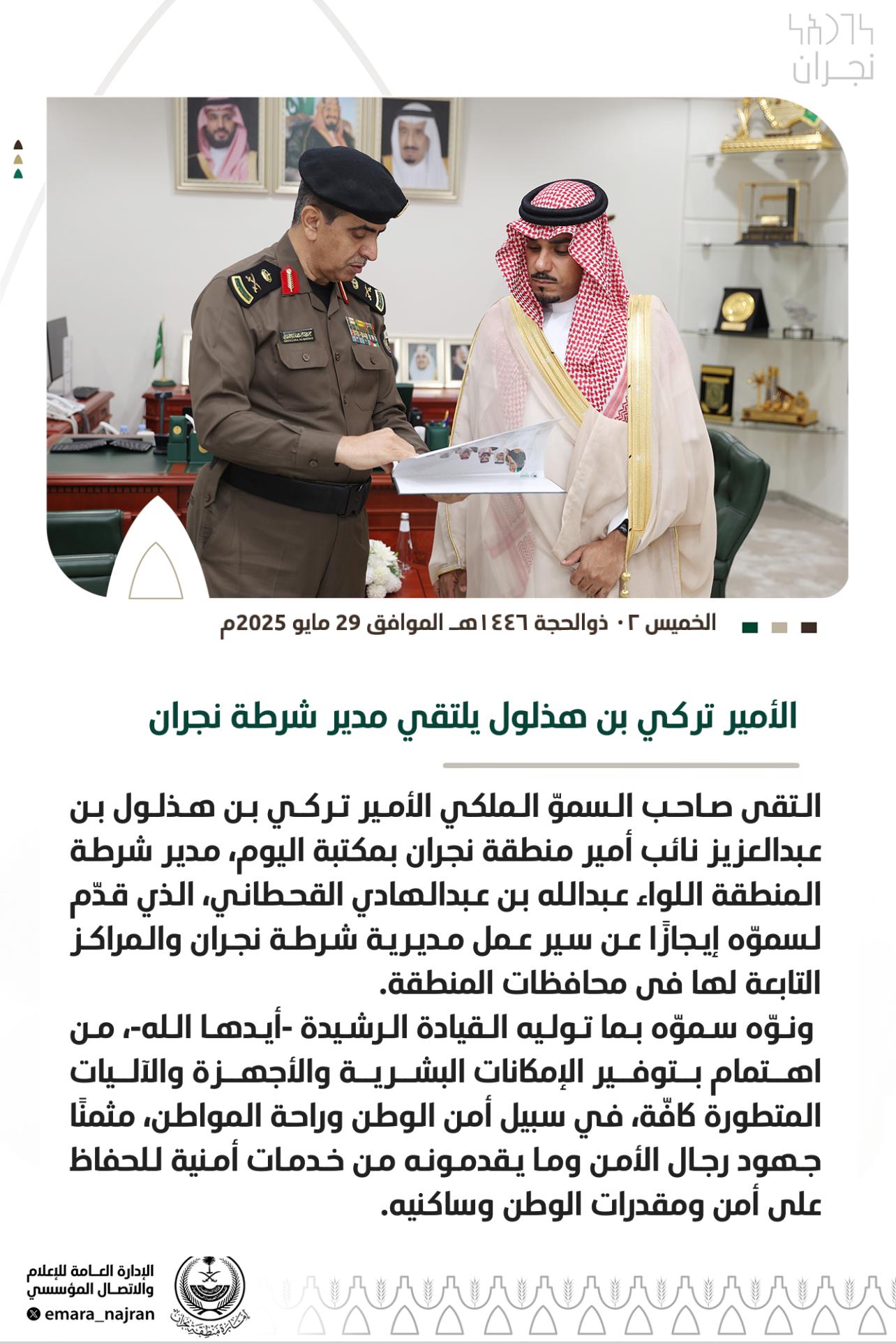 التقى صاحب السموّ الملكي الأمير تركي بن هذلول بن عبدالعزيز نائب أمير منطقة نجران بمكتبة اليوم، مدير شرطة المنطقة اللواء عبدالله بن عبدالهادي القحطاني، الذي قدّم لسموّه إيجازًا عن سير عمل مديرية شرطة نجران والمراكز التابعة لها في محافظات المنطقة.
