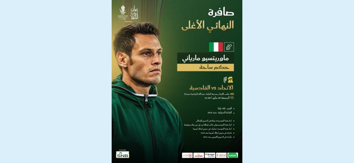 أعلن الاتحاد السعودي لكرة القدم تعيين الحكم الإيطالي ماوريتسيو مارياني لقيادة المباراة النهائية لبطولة كأس خادم الحرمين الشريفين، والتي ستجمع بين فريقي الاتحاد والقادسية.