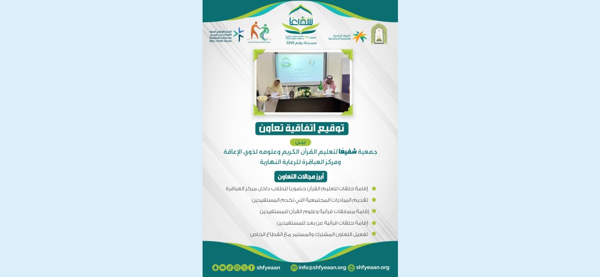 وقّعت جمعية شفيعًا لتعليم القرآن الكريم وعلومه لذوي الإعاقة اتفاقية تعاون مع مركز العباقرة للرعاية النهارية، بهدف تعزيز الجهود المشتركة في خدمة وتمكين ذوي الإعاقة عبر برامج تعليمية وتأهيلية متخصصة.