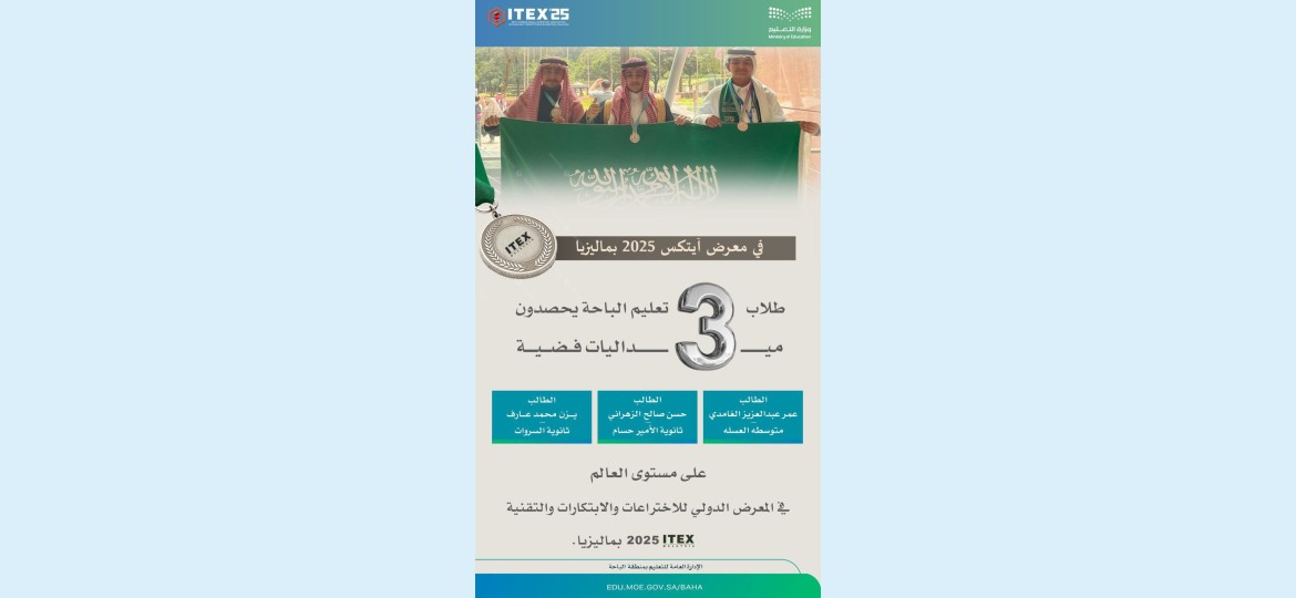 حصد الطالب عمر عبدالعزيز الغامدي من مدرسة العسلة المتوسطة، والطالب حسن صالح الزهراني من ثانوية الأمير د. حسام، والطالب يزن محمد عارف من ثانوية السراوات التابعة للإدارة العامة للتعليم بمنطقة الباحة الميدالية الفضية على مستوى العالم، عبر مشاركتهم ضمن الفريق السعودي الممثل للوطن في المعرض الدولي للاختراعات والابتكارات والتقنية ITEX 2025 في ماليزيا.
