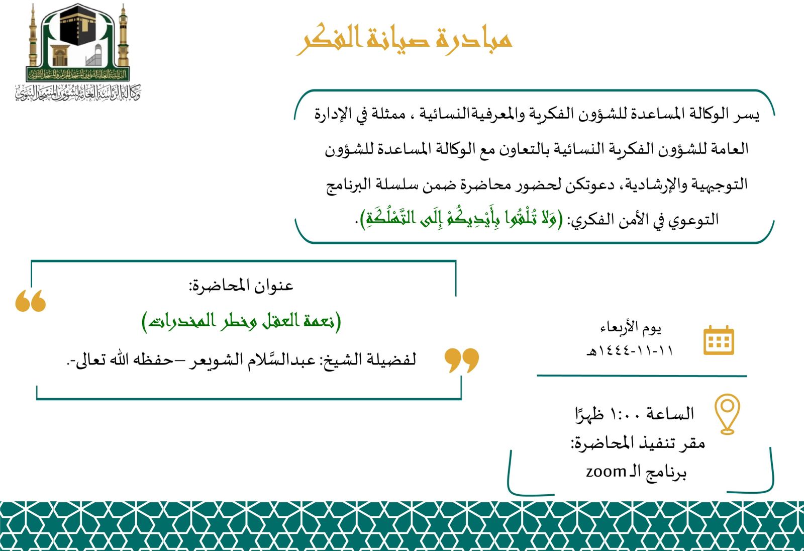 وكالة الرئاسة العامة لشؤون المسجد النبوي ممثلة في الوكالة المساعدة للشؤون الفكرية والمعرفية النسائية نفذت حزمة من البرامج التوعوية والدروس العلمية ضمن مبادرة صيانة فكر المعتمدة من أمارة منطقة المدينة المنورة في خطة موسم الحج لعام ١٤٤٤هـ .