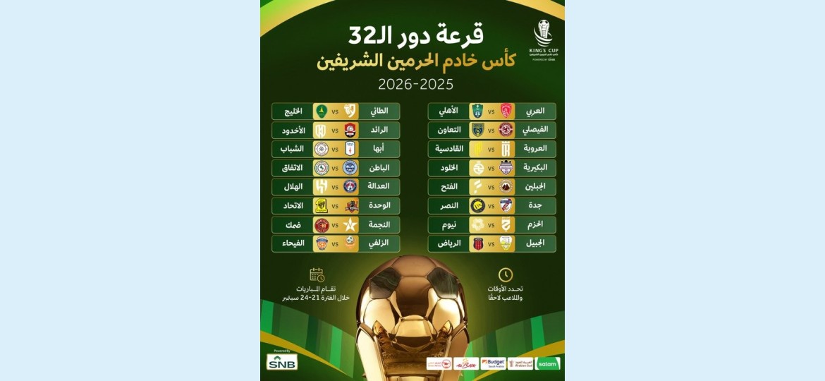 ويلعب الأهلي مع العربي والنصر مع جده وذلك في دور 32 من المسابقة ، وسيصدر الاتحاد مواعيد المباريات في وقت لاحق بعد ان يعد جدولة الدوري بالتعاون مع رابطة دوري المحترفين وتتحدد مشاركات الفرق السعودية اسيويا ، عربيا ، وخليجيا