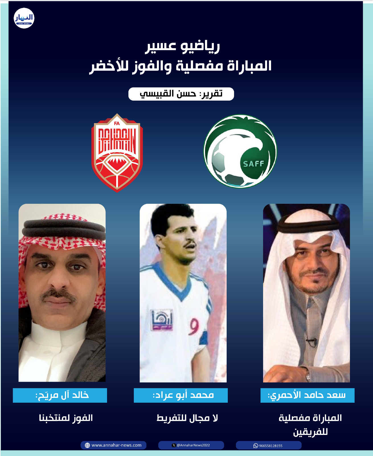 وختم تصريحه لصحيفة النهار بأن المنتخب السعودي قادر للفوز في المباراة عند حضور التركيز واللعب بحماس منضبط.