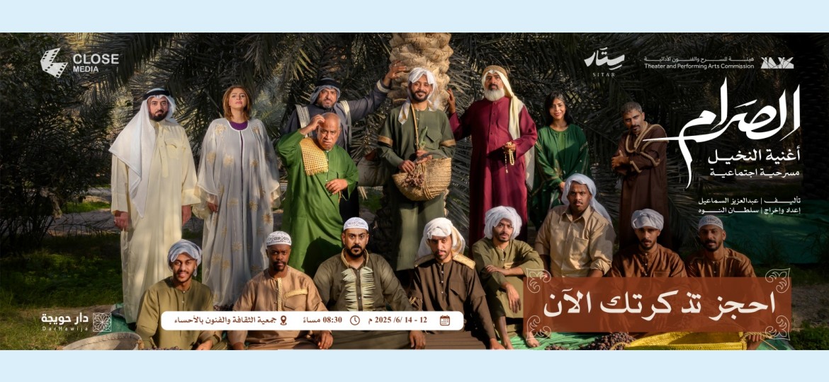 تنظم الجمعية العربية السعودية للثقافة والفنون بالأحساء عرضًا مسرحيًا بعنوان "الصرام (أغنية النخيل)"، يُجسد البيئة الزراعية التقليدية في الأحساء، من خلال عمل اجتماعي درامي يروي صراعات الإنسان البسيط في وجه تحديات الماضي، ويضم مشاهد إنسانية عذبة وقصص حب بريئة، تتخللها لمحات كوميدية خفيفة.