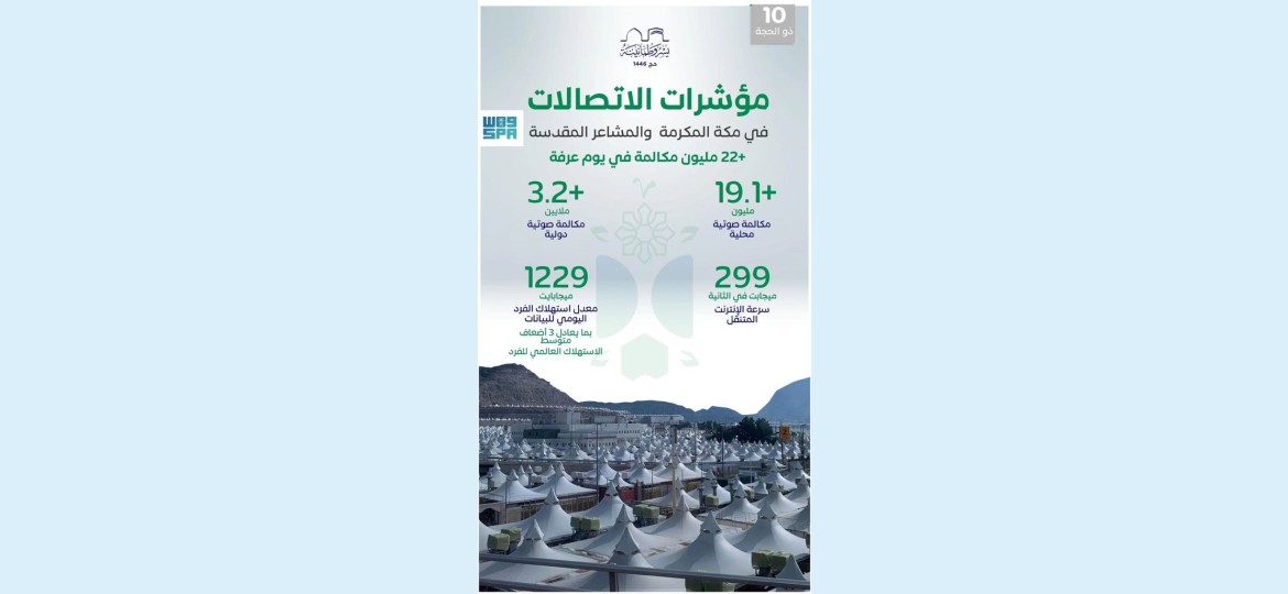 كشفت هيئة الاتصالات والفضاء والتقنية اليوم عن أداء شبكات الاتصالات بمكة المكرمة والمشاعر المقدسة خلال يوم عيد الأضحى العاشر من ذي الحجة 1446هـ، حيث بلغ إجمالي عدد المكالمات (22.3) مليون مكالمة، منها (19.1) مليون مكالمة محلية، (3.2) مليون مكالمة دولية.