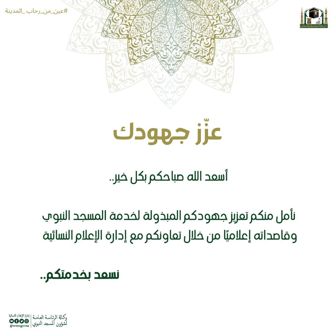 من أجل تعميق التواصل الإعلامي وتحسين الصورة الذهنية وتقديم الخدمات النوعية لقاصدات المسجد النبوي عمدت الوكالة المساعدة للشؤون الإعلامية والعلاقات والمعارض النسائية ممثلة في إدارة الإعلام النسائية لتنفيذ مبادرة ( عين من رحاب المدينة) والتي اعتمدت ضمن خطة موسم الحج لهذا العام ١٤٤٤هـ من قبل أمارة منطقة المدينة المنورة.