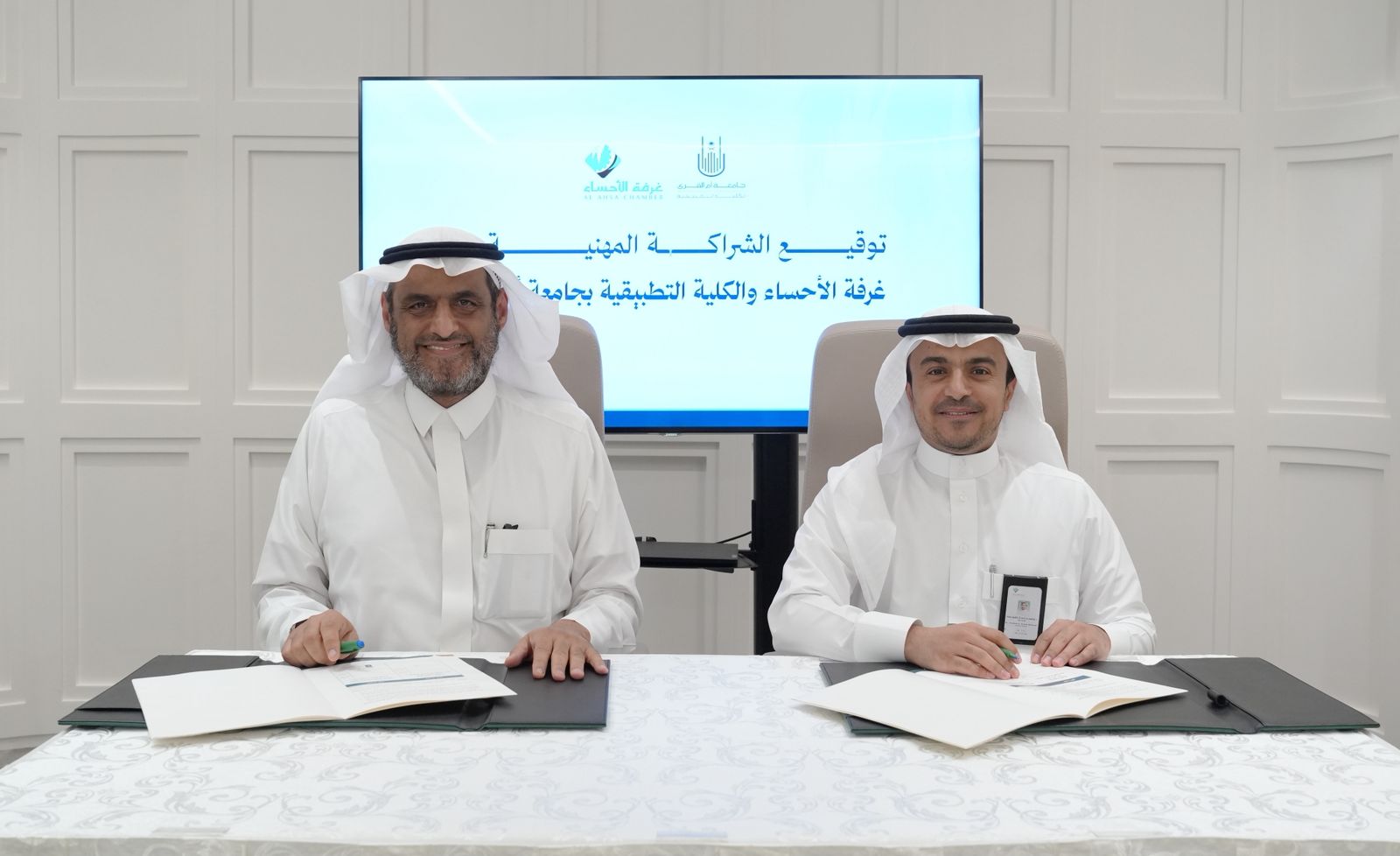 وقّعت غرفة الأحساء والكلية التطبيقية بجامعة أم القرى بعد ظهر اليوم الثلاثاء 17 يونيو اتفاقية شراكة مهنية لتعزيز أواصر التعاون في المجالات التدريبية والتأهيلية والاستشارية، وذلك بمجلس الأستاذ صالح العفالق بمبنى الغرفة.