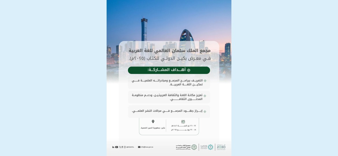 يشارك مجمع الملك سلمان العالمي للغة العربية في معرض بكين الدولي للكتاب 2025م، الذي يُقام في المدة من 18 إلى 22 يونيو الجاري في العاصمة الصينية بكين، ضمن جناح المملكة، الذي تُشرف عليه هيئة الأدب والنشر والترجمة، وبمشاركة عدد من الجهات الثقافية والعلمية السعودية.