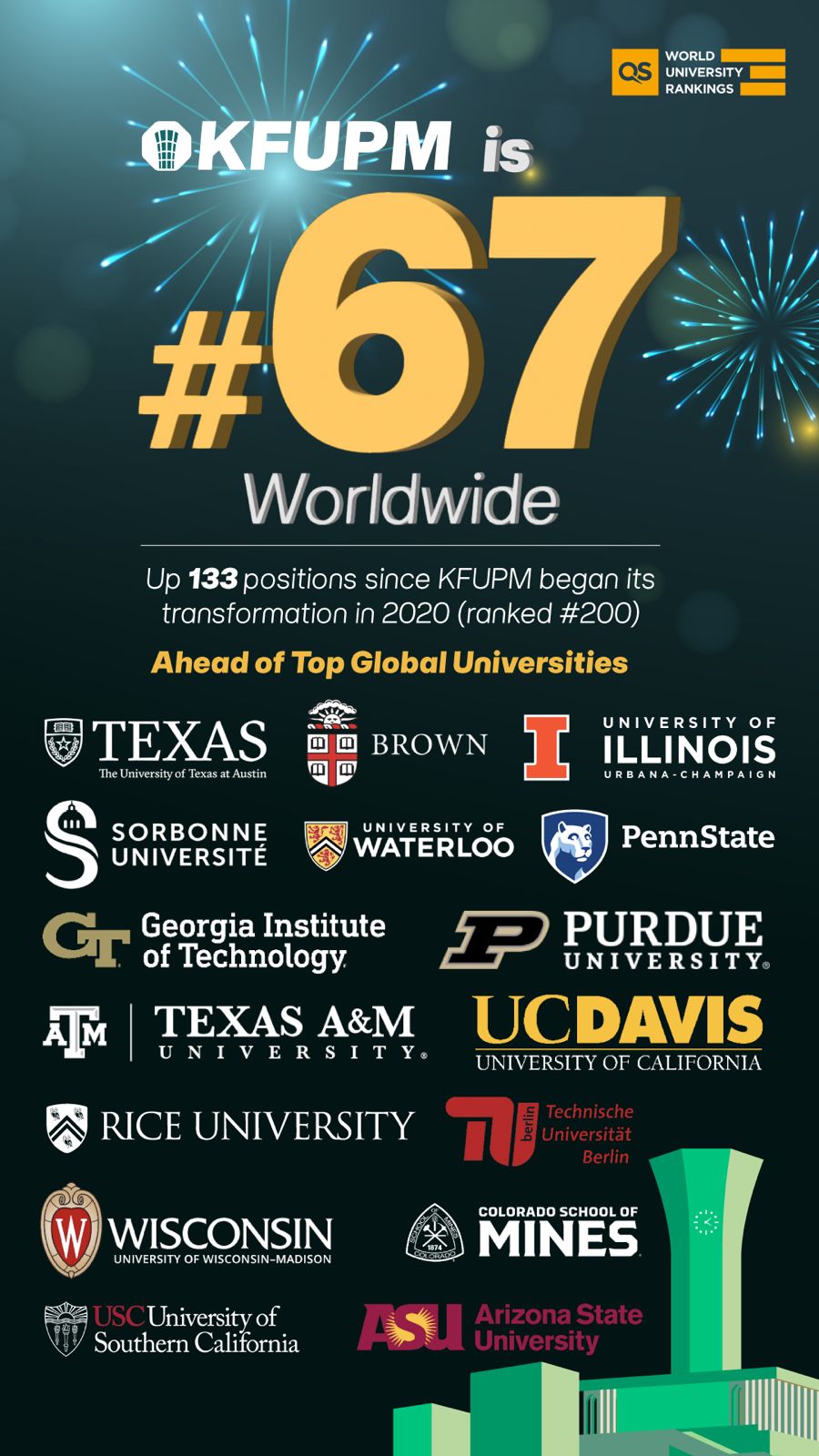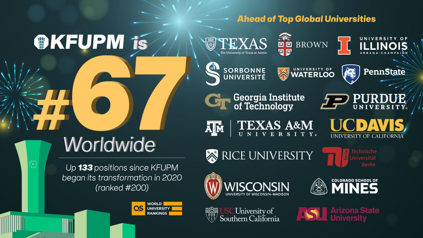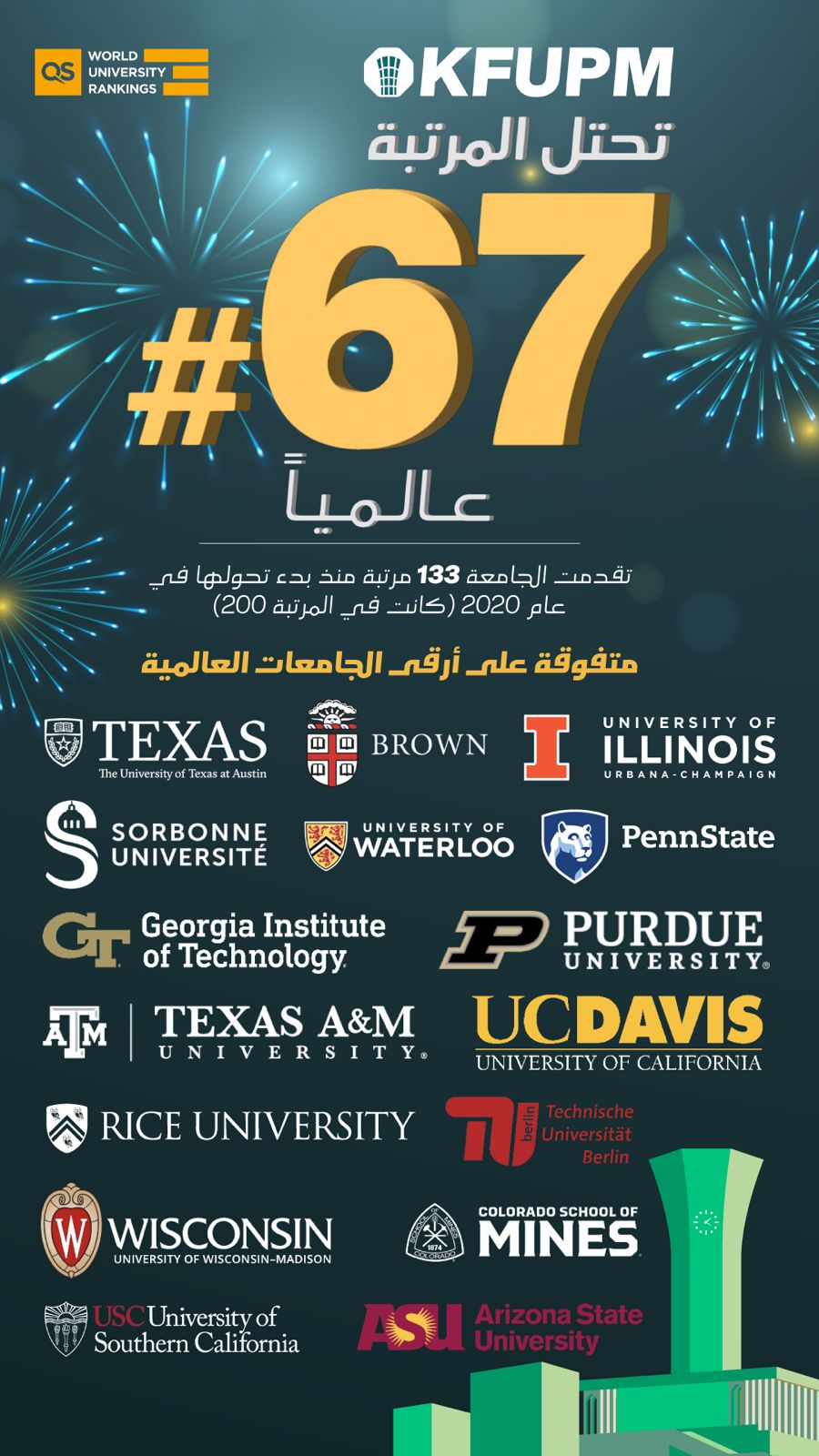 حققت جامعة الملك فهد للبترول والمعادن تقدماً عالمياً جديدًا بدخولها قائمة أفضل 100 جامعة على مستوى العالم، حيث تقدمت إلى المرتبة 67 عالميًا، وفقًا لتصنيف "كيو إس" (QS World University Rankings) لعام 2025، ويُعد هذا التقدم ثمرة مباشرة لمسار التحول الاستراتيجي الذي أطلقته الجامعة منذ عام 2020، حيث انتقلت خلال خمسة أعوام من المرتبة 200 إلى المرتبة 67.