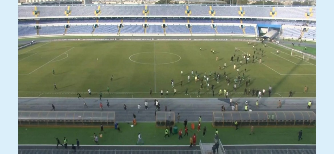 وفي خضم هذه الفوضى، اقتحمت الجماهير الملعب رغم إقامة اللقاء دون حضور جماهيري، وانقطع البث التلفزيوني المباشر للحدث. وزاد المشهد توتراً بعد انتشار مقطع مصور يُظهر مسلحين يطلقون النار في محيط الملعب، ما أثار موجة من القلق والغضب عبر مواقع التواصل الاجتماعي.