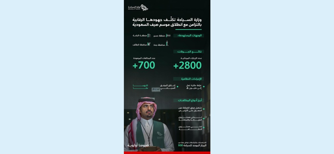 ونفذت الفرق الرقابية التابعة للوزارة أكثر من 2800 زيارة رقابية وتفقدية في الوجهات الصيفية، ووقفت الوزارة من خلال الزيارات الرقابية على مستوى جودة الخدمات المقدمة، وتوفر متطلبات السلامة، ومستوى النظافة، والتأكد من حصولها على الترخيص اللازم من وزارة السياحة لمزاولة النشاط.