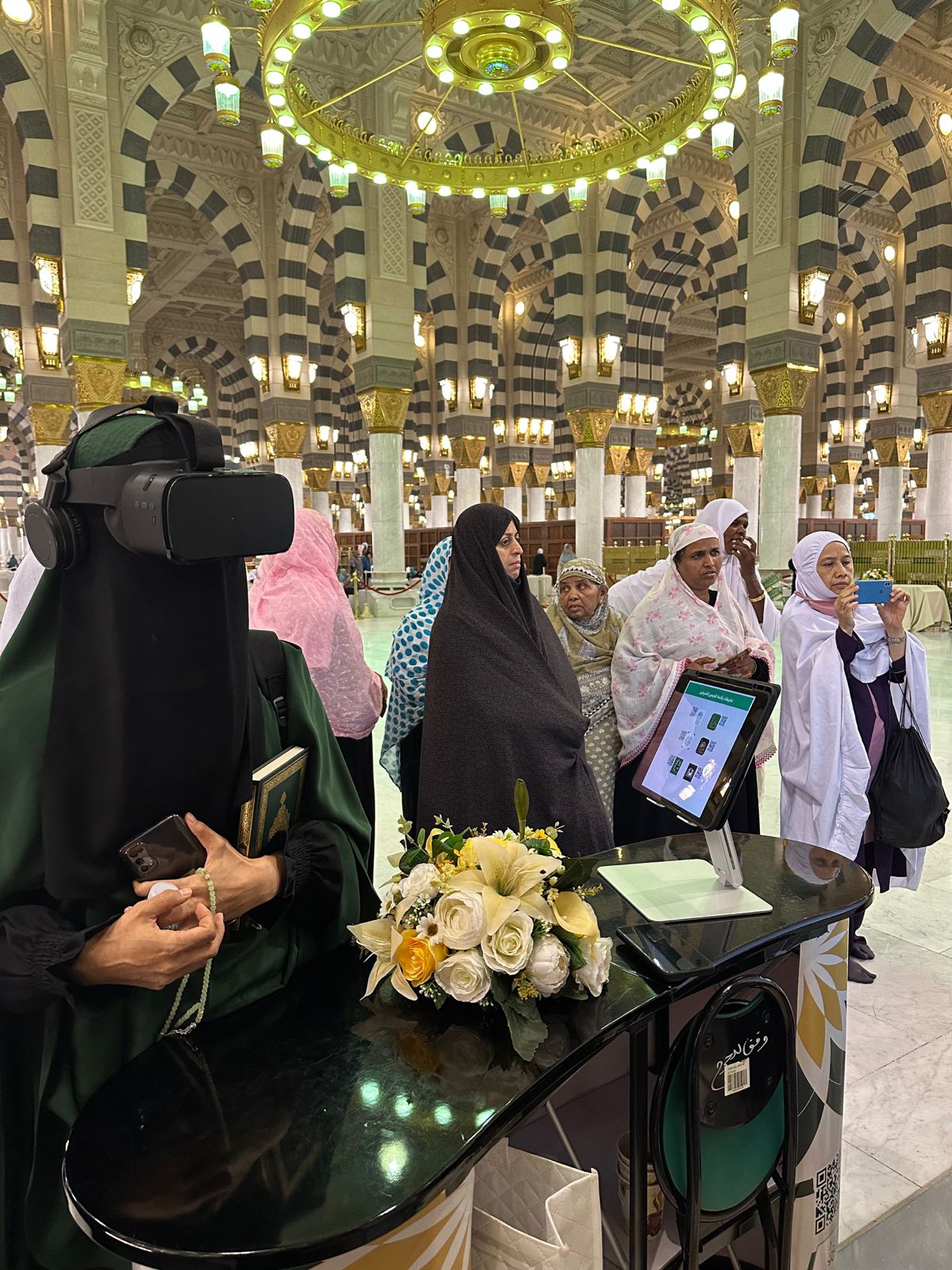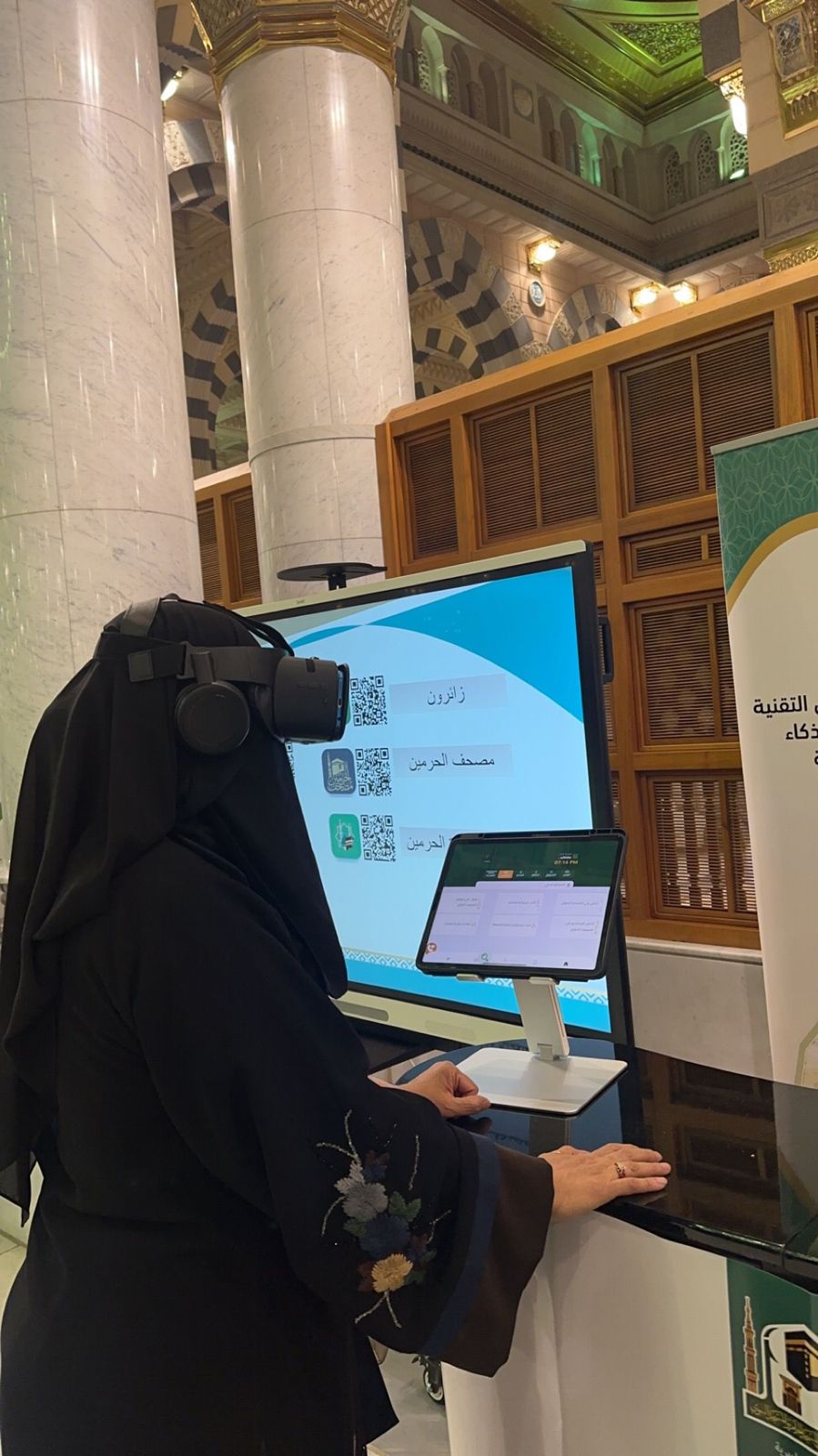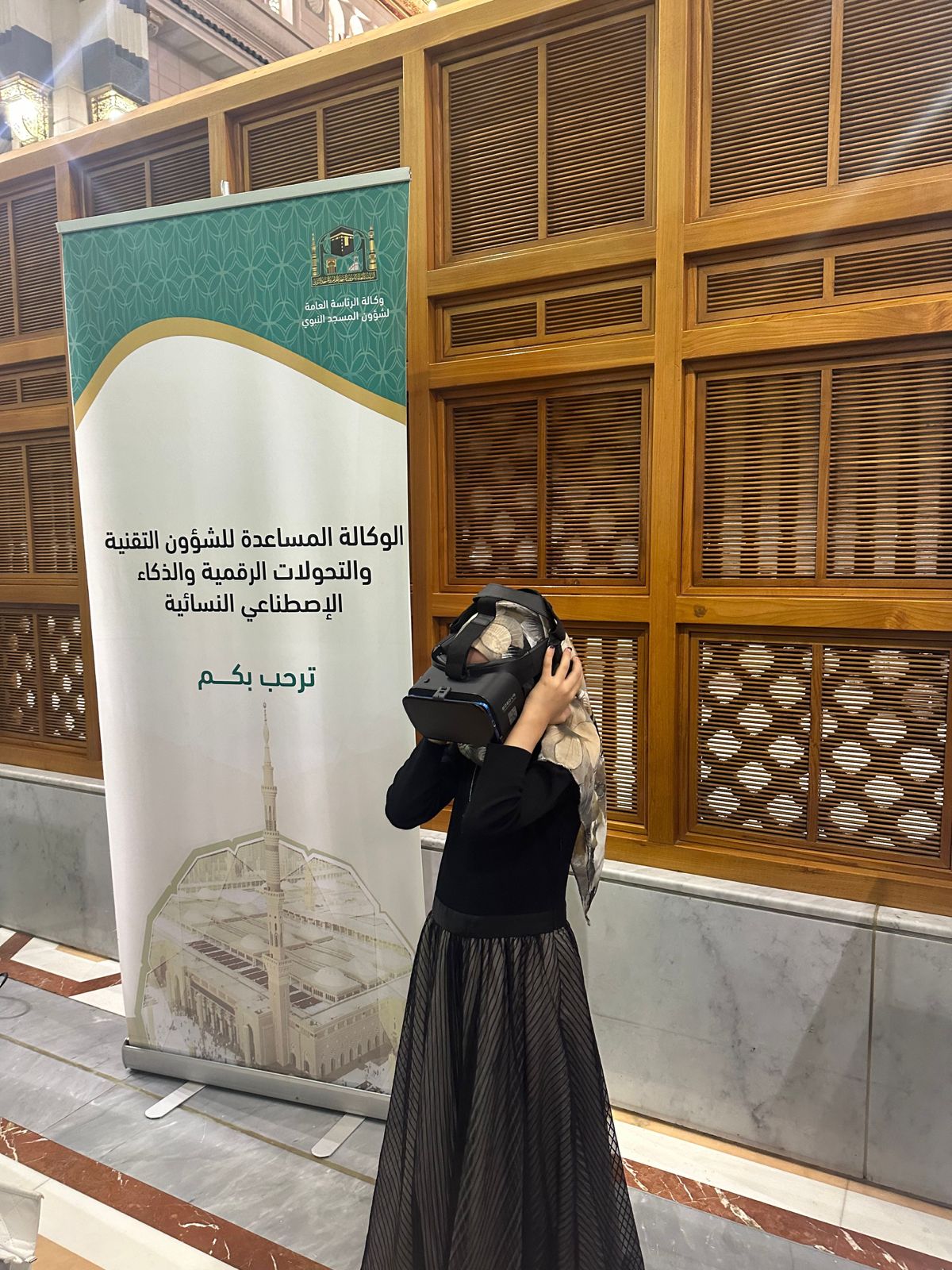 مواكبة لروح العصر عمدت الرئاسة العامة لشؤون المسجد الحرام والمسجد النبوي إلى وجود وكالة متخصصة تُعنى بالتقنية والتحولات الرقمية والذكاء الاصطناعي. وفي معرض ( عطاء وإثراء٢) الذي نظم في رحاب المسجد النبوي من قبل وكالة الرئاسة العامة لشؤون المسجد النبوي ممثلا في الوكالة المساعدة للشؤون الإعلامية والعلاقات والمعارض النسائية وعلى مدار تسعة أيام استقطب معرض ( عطاء وإثراء٢) زائرات المسجد النبوي ولفت أنظارهن الركن المخصص للوكالة المساعدة للشؤون التقنية والتحولات الرقمية والذكاء الاصطناعي حيث حظيت الزائرات بتجربة فريدة من نوعها والتي تستخدم لأول مرة في المعارض المقامة في المسجد النبوي حيث تم استخدام تقنية(VR) الواقع الافتراضي لإثراء تجربتهن والتعرف على معالم الروضة الشريفة ومحاكاة للواقع الذي تعيشه الزائرة حقيقة في هذه البقعة المباركة والتي تهفو لها كل القلوب المؤمنة بأنها روضة من رياض الجنة، وأفادت الوكيل المساعد للشؤون التقنية والتحولات الرقمية والذكاء الاصطناعي الأستاذة مها الحويطي بأن هذه التجربة تعد نقلة نوعية في مجال الواقع الافتراضي بوكالة المسجد النبوي النسائية؛ حيث مكّنت هذه التقنية قاصدات المسجد النبوي من مشاهدة الروضة الشريفة بمجرد لبس النظارة الخاصة بالجهاز ومشاهدة المنبر والمحراب والحجرة النبوية ؛ والاستماع إلى صوت الأذان، مما يضيف للزائرة تجربة استثنائية تستمتع بها وتحتفظ في ذاكرتها روعة الزمان والمكان أثناء زيارتها للمسجد النبوي في أجواء روحانية تغشاها السكينة والطمأنينة والأمان .
