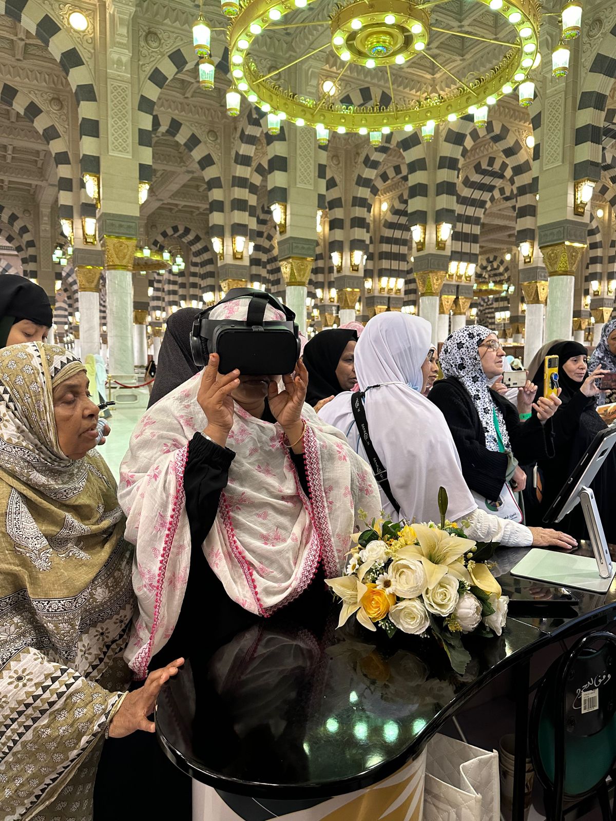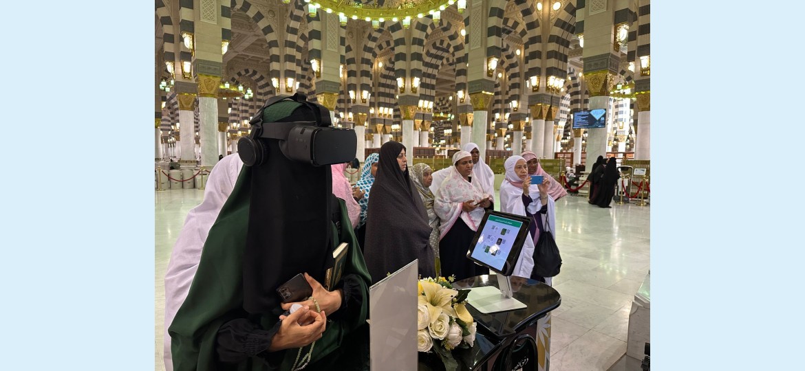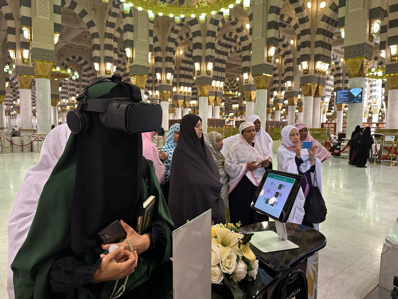 مواكبة لروح العصر عمدت الرئاسة العامة لشؤون المسجد الحرام والمسجد النبوي إلى وجود وكالة متخصصة تُعنى بالتقنية والتحولات الرقمية والذكاء الاصطناعي. وفي معرض ( عطاء وإثراء٢) الذي نظم في رحاب المسجد النبوي من قبل وكالة الرئاسة العامة لشؤون المسجد النبوي ممثلا في الوكالة المساعدة للشؤون الإعلامية والعلاقات والمعارض النسائية وعلى مدار تسعة أيام استقطب معرض ( عطاء وإثراء٢) زائرات المسجد النبوي ولفت أنظارهن الركن المخصص للوكالة المساعدة للشؤون التقنية والتحولات الرقمية والذكاء الاصطناعي حيث حظيت الزائرات بتجربة فريدة من نوعها والتي تستخدم لأول مرة في المعارض المقامة في المسجد النبوي حيث تم استخدام تقنية(VR) الواقع الافتراضي لإثراء تجربتهن والتعرف على معالم الروضة الشريفة ومحاكاة للواقع الذي تعيشه الزائرة حقيقة في هذه البقعة المباركة والتي تهفو لها كل القلوب المؤمنة بأنها روضة من رياض الجنة، وأفادت الوكيل المساعد للشؤون التقنية والتحولات الرقمية والذكاء الاصطناعي الأستاذة مها الحويطي بأن هذه التجربة تعد نقلة نوعية في مجال الواقع الافتراضي بوكالة المسجد النبوي النسائية؛ حيث مكّنت هذه التقنية قاصدات المسجد النبوي من مشاهدة الروضة الشريفة بمجرد لبس النظارة الخاصة بالجهاز ومشاهدة المنبر والمحراب والحجرة النبوية ؛ والاستماع إلى صوت الأذان، مما يضيف للزائرة تجربة استثنائية تستمتع بها وتحتفظ في ذاكرتها روعة الزمان والمكان أثناء زيارتها للمسجد النبوي في أجواء روحانية تغشاها السكينة والطمأنينة والأمان .