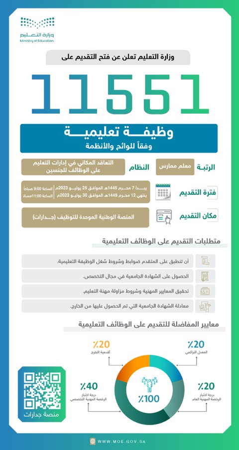 أعلنت وزارة التعليم طرح وظائف شاغرة لـ 11551 وظيفة تعليمية للعام الدراسي 1445هـ، في عدد من التخصصات في إدارات التعليم للجنسين بنظام التعاقد، من خلال المنصة الوطنية الموحدة للتوظيف "جدارات" .