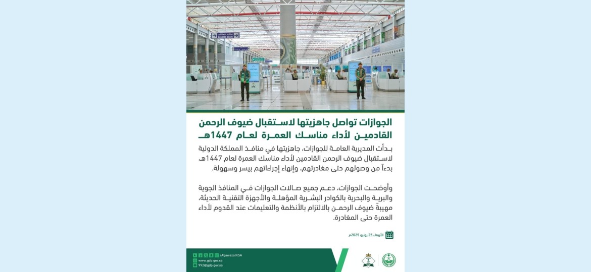 بدأت المديرية العامة للجوازات جاهزيتها في منافذ المملكة الدولية لاستقبال ضيوف الرحمن القادمين لأداء مناسك العمرة لعام 1447هـ، بدءًا من وصولهم حتى مغادرتهم، وإنهاء إجراءاتهم بيسر وسهولة.