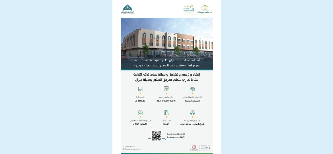 طرحت أمانة منطقة جازان 3 فرص استثمارية في مواقع متعددة بمدينة جيزان، وذلك عبر بوابة الاستثمار البلدي "فرص".