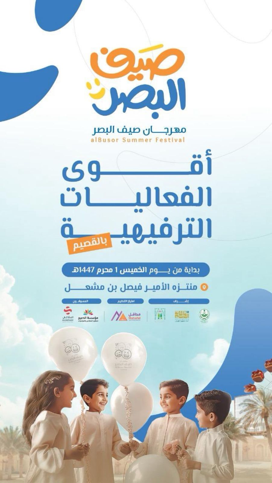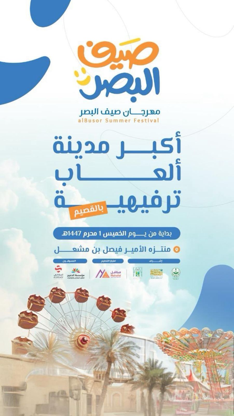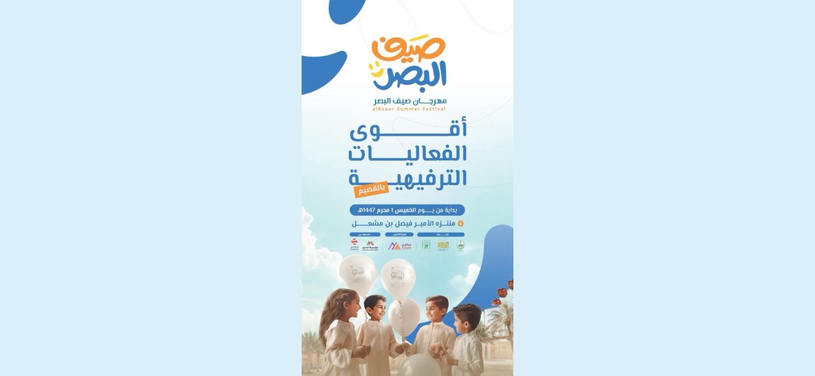 انطلقت مساء يوم الخميس، الموافق الأول من شهر محرّم لعام 1447هـ، فعاليات مهرجان صيف البصر في منتزه الأمير الدكتور فيصل بن مشعل بن سعود، بتنظيم من بلدية البصر، وبالتعاون مع القطاع الخاص ومشاركة عدد من الجهات الحكومية، وذلك ضمن الفعاليات الصيفية التي تهدف إلى تعزيز جودة الحياة وتقديم خيارات ترفيهية تناسب جميع أفراد المجتمع.