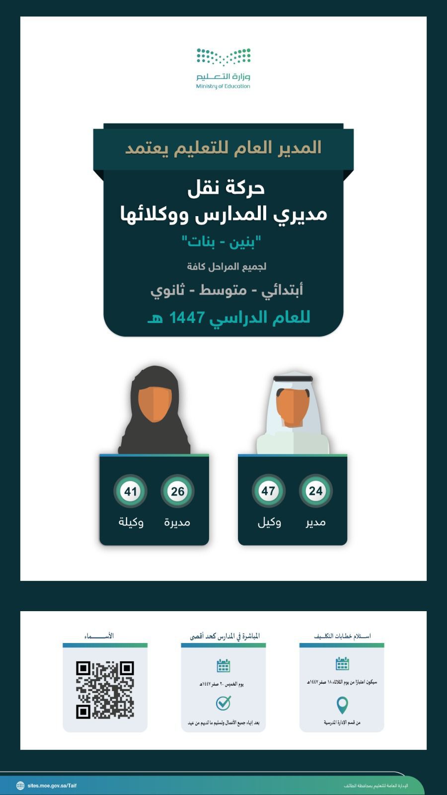 وأوضح المدير العام للتعليم بأن الحركة شملت: 24 مدير مدرسة، 26 مديرة مدرسة، 47 وكيل مدرسة 41 وكيلة مدرسة، مؤكداً بأن استلام خطابات التكليف ستكون اعتبارًا من يوم الثلاثاء 18 صفر 1447هـ من قسم الإدارة المدرسية، والمباشرة في المدارس كحد أقصى يوم الخميس 20 صفر 1447هـ، بعد إنهاء جميع الأعمال وتسليم ما لديهم من عهد، ومثمناً جهود الشؤون التعليمية في الاستعداد المبكر لإعلان الحركة للعام الدراسي 1447هـ.