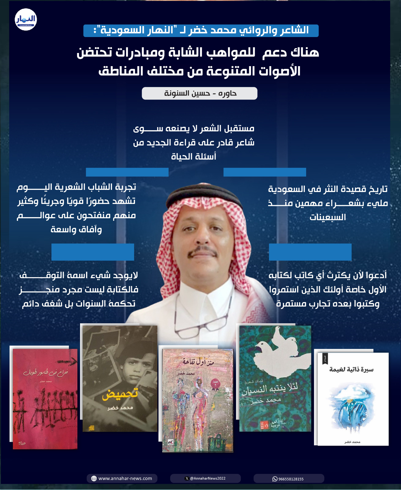 يقول الشاعر محمد خضر لصحيفة "النهار" عن تطور المشهد الثقافي في المملكة العربية السعودية إن ما نراه اليوم ليس مجرد “نشاط ثقافي”، بل من كونها هامشًا نخبوياً إلى كونها عنصرًا فاعلًا في صياغة الهوية، وتحفيز الخيال الجمعي، وتفعيل الحوار المجتمعي هناك مساحات جديدة للكتابة والفنون والمسرح والسينما، وهناك دعم للمواهب الشابة، ومبادرات تحتضن الأصوات المتنوعة من مختلف المناطق، كما أن الحراك الثقافي لم يعد محصورًا في أمكنة بعينها، بل أصبح ممتدًا في كل الجهات، وهذا في حد ذاته كسر لمركزية المشهد وتحرير للطاقة الإبداعية