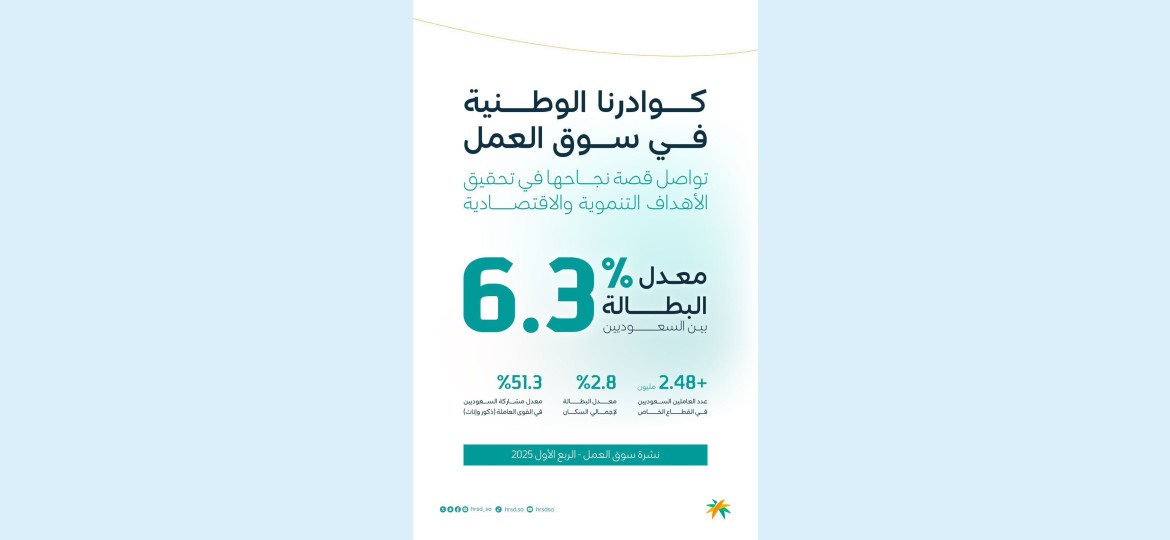 حيث كشفت النشرة عن انخفاض مستوى بطالة السعوديين إلى ما يعادل 6.3٪ مع ارتفاع معدل مشاركة السعوديين في سوق العمل إلى ٥١.٣٪ حصة الذكور منها ٦٦.٤٪ فيما تبلغ نسبة مشاركة الإناث في السوق ٣٦.٣٪ .