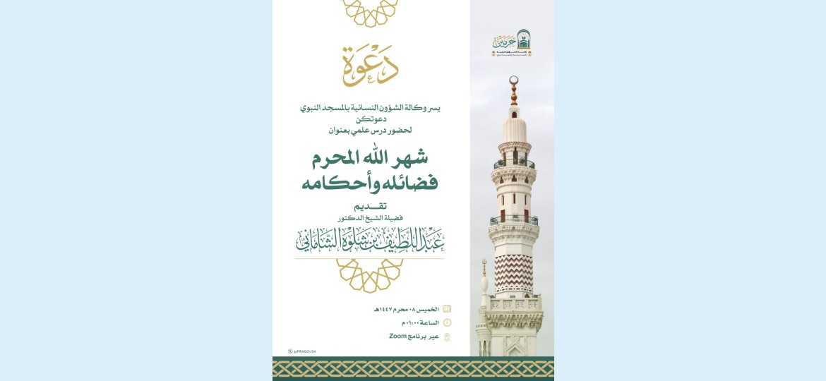 نفذت وكالة الشؤون النسائية في المسجد النبوي درساً علمياً بعنوان ( شهر الله المحرم فضائله وأحكامه) قدمه فضيلة الشيخ الدكتور عبداللطيف الشاماني في مساء يوم الخميس عبر برنامج الزووم عن بعد.