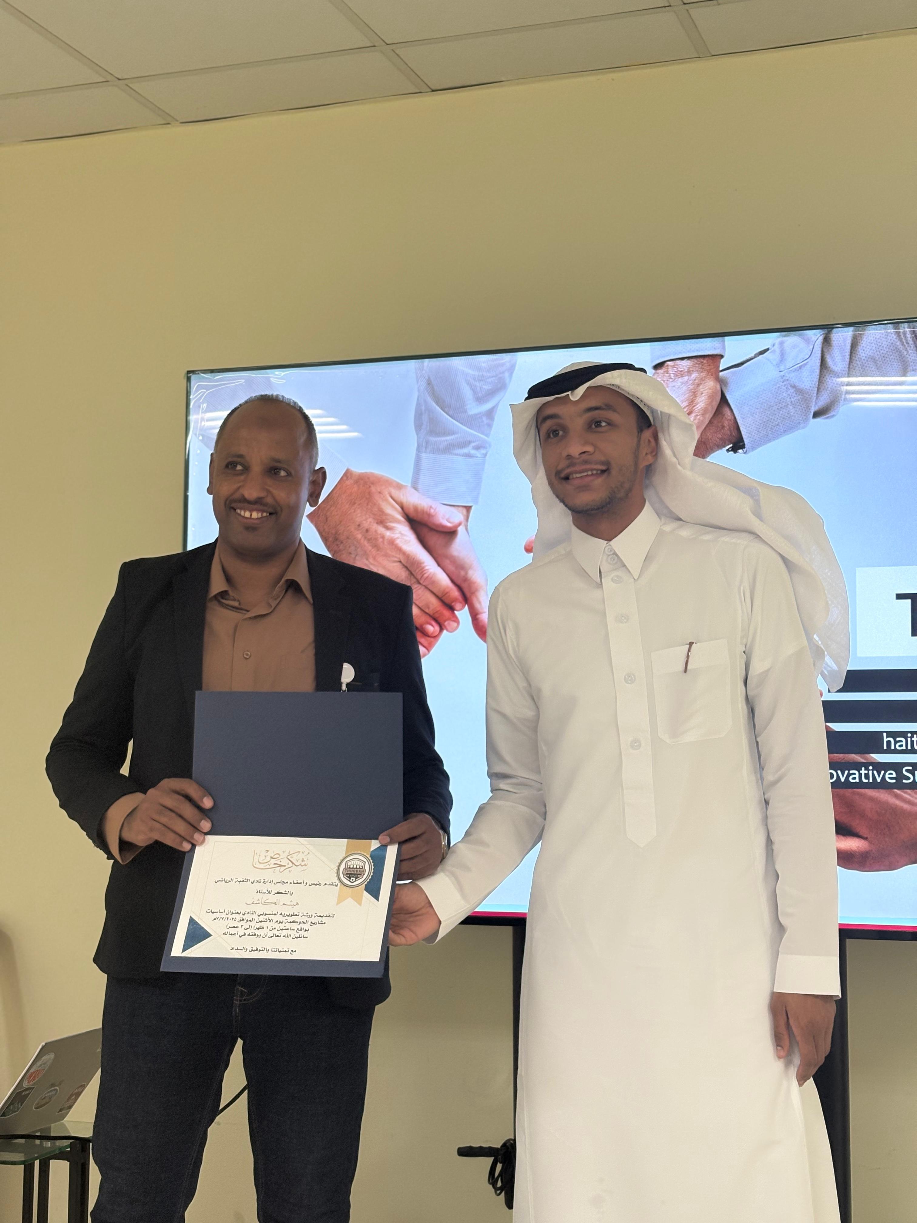1. ورشة “القانون الرياضي” – قدمها الأستاذ يوسف المطوع، بهدف رفع الوعي بالأنظمة والتشريعات الرياضية، وتمكين منسوبي النادي من التعامل القانوني السليم مع القضايا واللوائح ذات الصلة.
