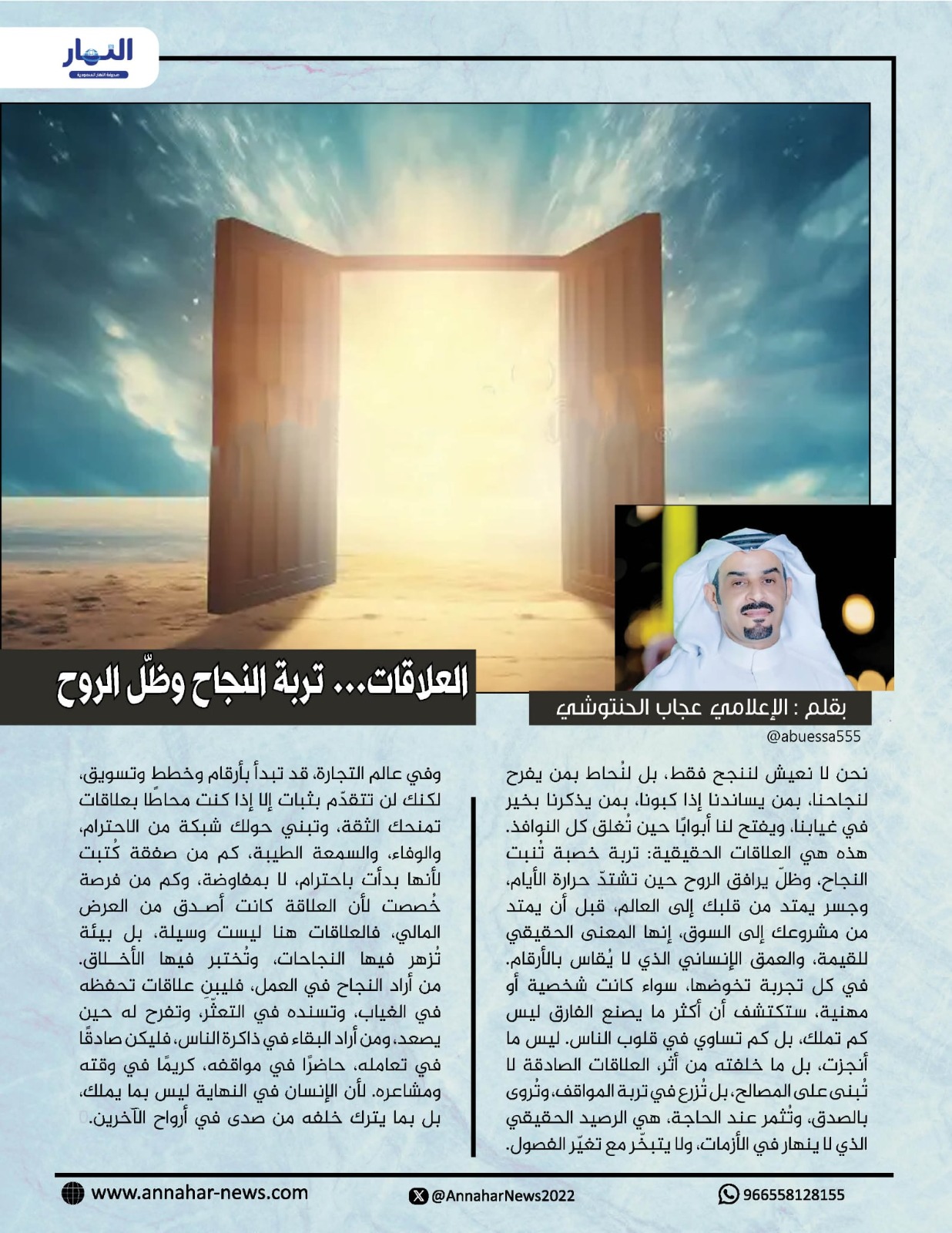 نحن لا نعيش لننجح فقط، بل لنُحاط بمن يفرح لنجاحنا، بمن يساندنا إذا كبونا، بمن يذكرنا بخير في غيابنا، ويفتح لنا أبوابًا حين تُغلق كل النوافذ. هذه هي العلاقات الحقيقية: تربة خصبة تُنبت النجاح، وظلّ يرافق الروح حين تشتدّ حرارة الأيام، وجسر يمتد من قلبك إلى العالم، قبل أن يمتد من مشروعك إلى السوق، إنها المعنى الحقيقي للقيمة، والعمق الإنساني الذي لا يُقاس بالأرقام.