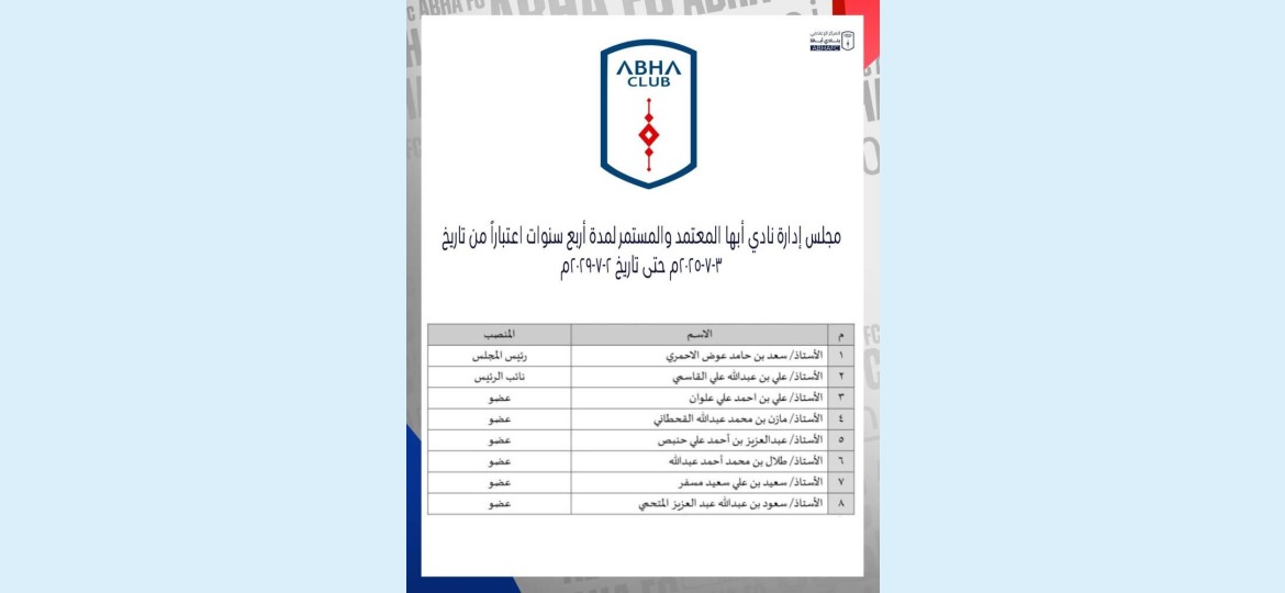 اعتمد وكيل وزارة الرياضة لشؤون الرياضة والشباب، عبدالعزيز المسعد، تشكيل مجلس إدارة نادي أبها بمنطقة عسير، وذلك لمدة أربع سنوات تبدأ من 3 يوليو 2025 وتنتهي في 2 يوليو 2029.