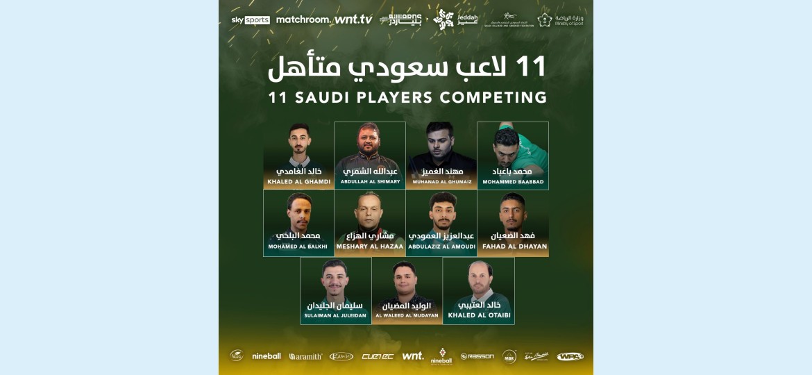 يشارك 11 لاعباً سعودي في بطولة العالم للبلياردو التي تقام للعام الثاني على التوالي في المملكة خلال الفترة من 21 حتى 26 يوليو 2025م في الصالات الرياضية الخضراء بجدة، بتنظيم مشترك بين الاتحاد السعودي للبلياردو والسنوكر وشركة ماتشروم، وتحت إشراف وزارة الرياضة، وبمشاركة أفضل 100 لاعب عالمي سيتنافسون على جائزة مالية قدرها مليون دولار أمريكي .