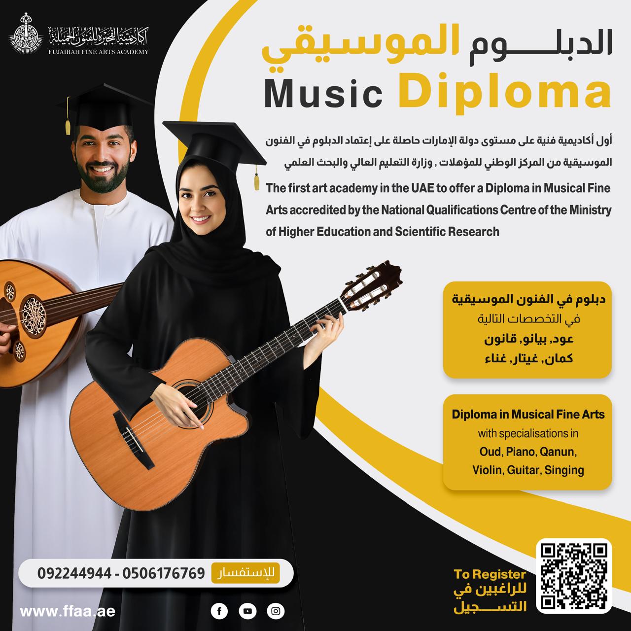 أعلنت أكاديمية الفجيرة للفنون الجميلة خلال مؤتمر صحفي عُقد في مدينة الإبداع – الفجيرة، عن إطلاق دبلوم الفنون الموسيقية، الأول من نوعه في دولة الإمارات والمعتمد من المركز الوطني للمؤهلات – وزارة التعليم العالي والبحث العلمي.