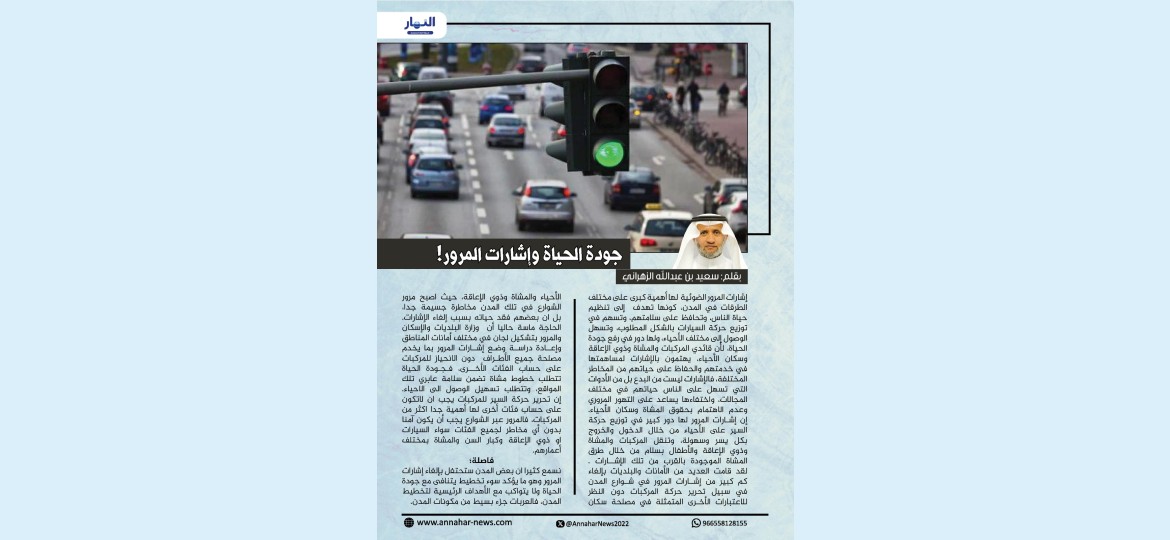 إشارات المرور الضوئية لها أهمية كبرى على مختلف الطرقات في المدن، كونها تهدف إلى تنظيم حياة الناس، وتحافظ على سلامتهم، وتسهم في توزيع حركة السيارات بالشكل المطلوب، وتسهل الوصول إلى مختلف الأحياء، ولها دور في رفع جودة الحياة، لأن قائدي المركبات والمشاة وذوي الإعاقة وسكان الأحياء، يهتمون بالإشارات لمساهمتها في خدمتهم والحفاظ على حياتهم من المخاطر المختلفة، فالإشارات ليست من البدع بل من الأدوات التي تسهل على الناس حياتهم في مختلف المجالات، واختفاءها يساعد على التهور المروري وعدم الاهتمام بحقوق المشاة وسكان الأحياء.