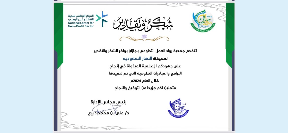 تقدمت جمعية رواد العمل التطوعي بمحافظة جازان بخالص الشكر والتقدير لـ"صحيفة النهار السعودية"، معربةً عن امتنانها للجهود الإعلامية التي بذلتها الصحيفة في دعم وإنجاح البرامج والمبادرات التطوعية التي نفذتها الجمعية خلال عام 2024م.