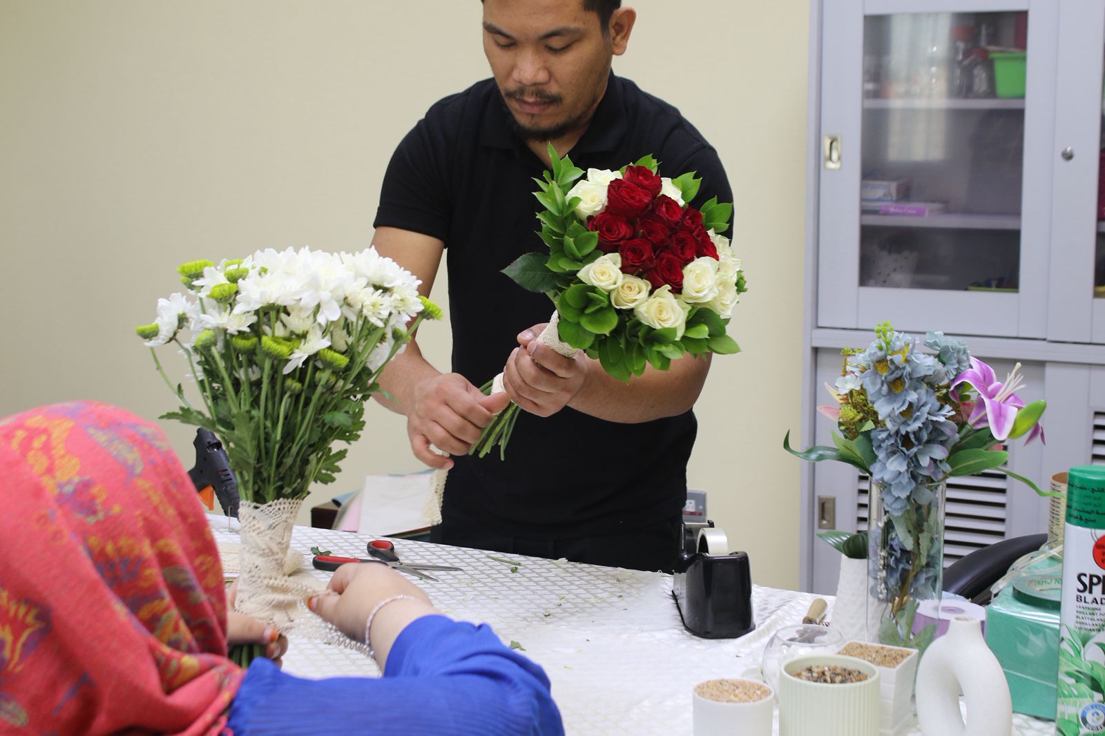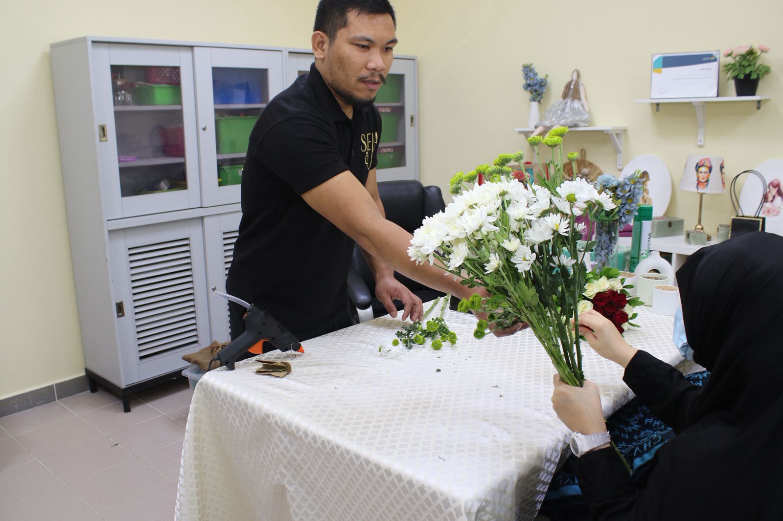 تعرف المستفيدات من خلال الورشة على أنواع الورد والخامات المستخدمة والتكنيكات المختلفة والمميزة في التنسيق.