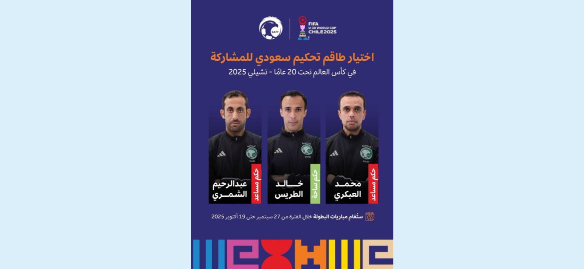 أعلن الاتحاد الدولي لكرة القدم (FIFA), عن اختيار طاقم تحكيم سعودي للمشاركة في إدارة مباريات كأس العالم تحت (20) عامًا 2025، المقرر إقامتها في تشيلي خلال الفترة من (27) سبتمبر حتى (19) أكتوبر المقبل.