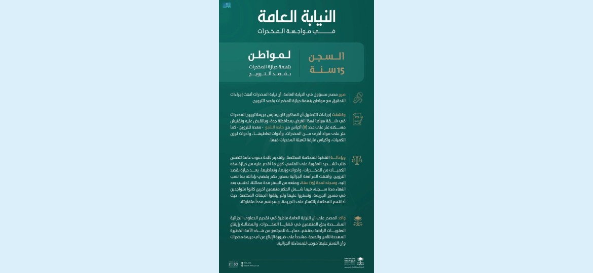 وبإحالة القضية للمحكمة المختصة، وتقديم لائحة دعوى عامة تتضمن طلب تشديد العقوبة على المتهم، كون ما أقدم عليه من حيازة هذه الكميات من المخدرات، وأدوات وزنها، وتعاطيها، يعد حيازة بقصد الترويج، وانتهت المرافعة الجزائية بصدور حكم يقضي بإدانته بما نسب إليه، وسجنه لمدة (15) سنة، ومنعه من السفر مدة مماثلة، تحتسب بعد انتهاء مدة سجنه، فيما شمل الحكم متهمين آخرين كانوا متواجدين في مسرح الجريمة، وتستروا عليها ولم يبلغوا الجهات المختصة، حيث أدانتهم المحكمة بالتستر على الجريمة، وسجنهم مدداً متفاوتة.
