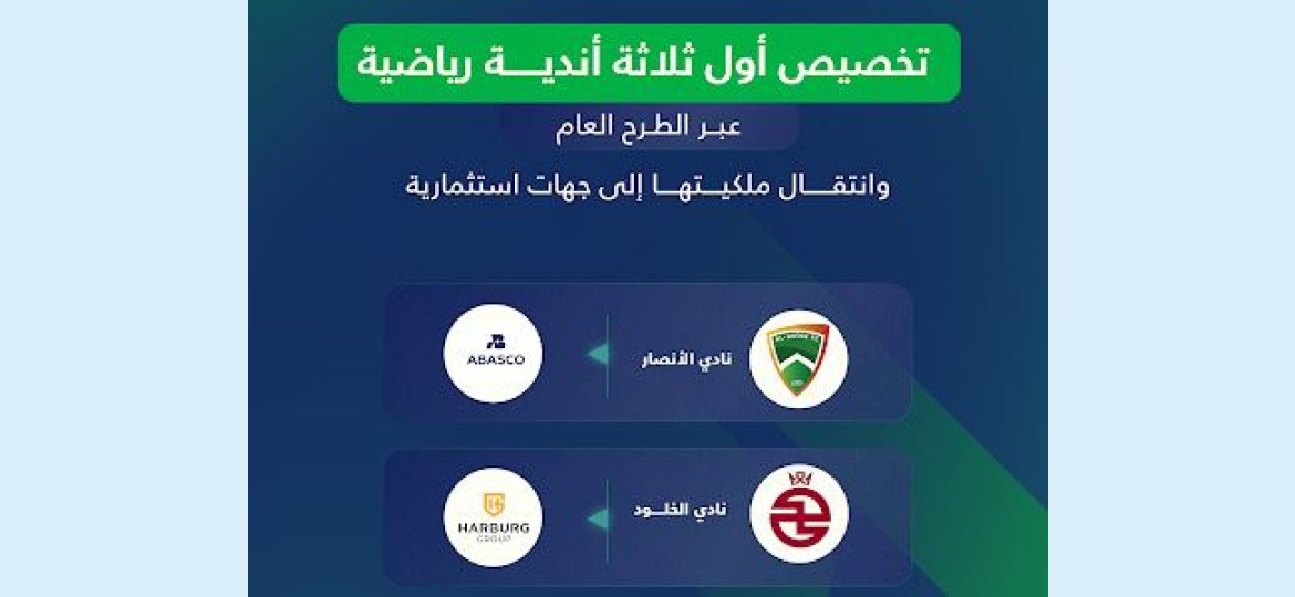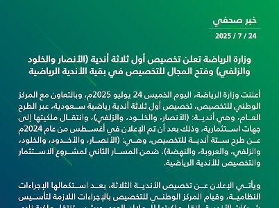 أعلنت وزارة الرياضة، اليوم الخميس 24 يوليو 2025م، وبالتعاون مع المركز الوطني للتخصيص، تخصيص أول ثلاثة أندية رياضية سعودية، عبر الطرح العام، وهي أندية: (الأنصار، والخلود، والزلفي)، وانتقال ملكيتها إلى جهات استثمارية، وذلك بعد أن تم الإعلان في أغسطس من عام 2024م عن طرح ستة أندية للتخصيص، وهي: (الأنصار، والأخدود، والخلود، والزلفي، والعروبة، والنهضة)، ضمن المسار الثاني لمشروع الاستثمار والتخصيص للأندية الرياضية.