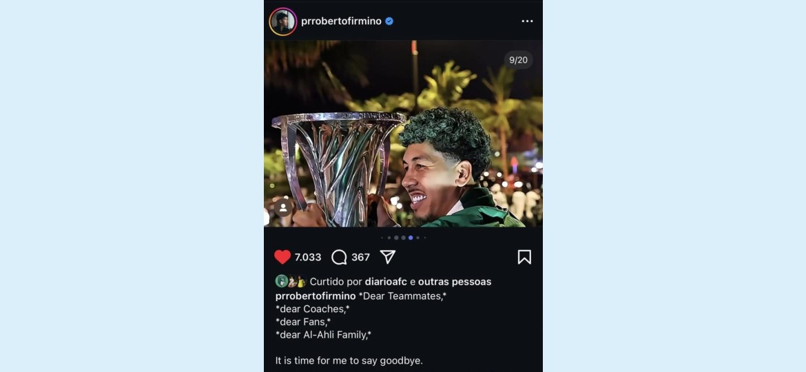 وجّه المهاجم البرازيلي روبرتو فيرمينو رسالة وداع مؤثرة لجماهير الأهلي السعودي وزملائه في الفريق، عبر حسابه الرسمي على "إنستغرام"، مؤكداً نهاية رحلته مع "الراقي" واقترابه من بدء تجربة جديدة مع السد القطري.