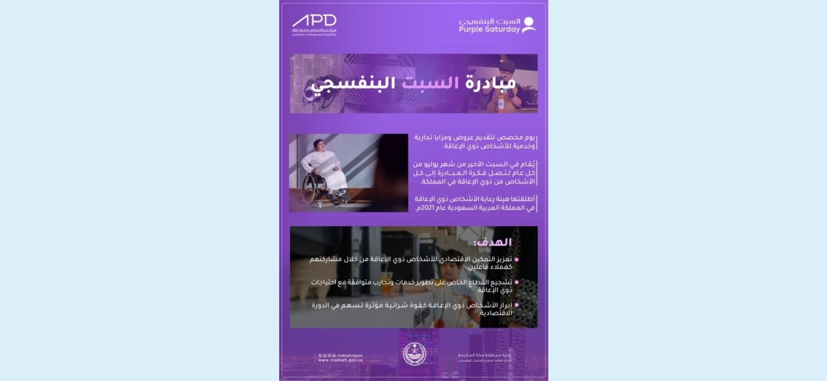 ويمكن للأشخاص ذوي الإعاقة معرفة العروض والمزايا المقدمة لهم من خلال شركاء السبت البنفسجي عن طريق الرابط التالي: https://apd.gov.sa/purple-saturday.