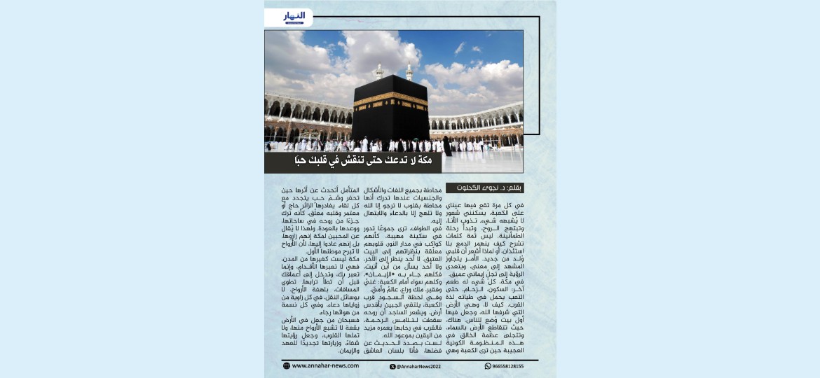 مكة ليست كغيرها من المدن، فهي لا تعبرها الأقدام، وإنما تعبر بك، وتدخل إلى أعماقك قبل أن تطأ ترابها. تطوي المسافات، بلهفة الأرواح، لا بوسائل النقل، في كل زاوية من زواياها دعاء، وفي كل نسمة من هوائها رجاء.