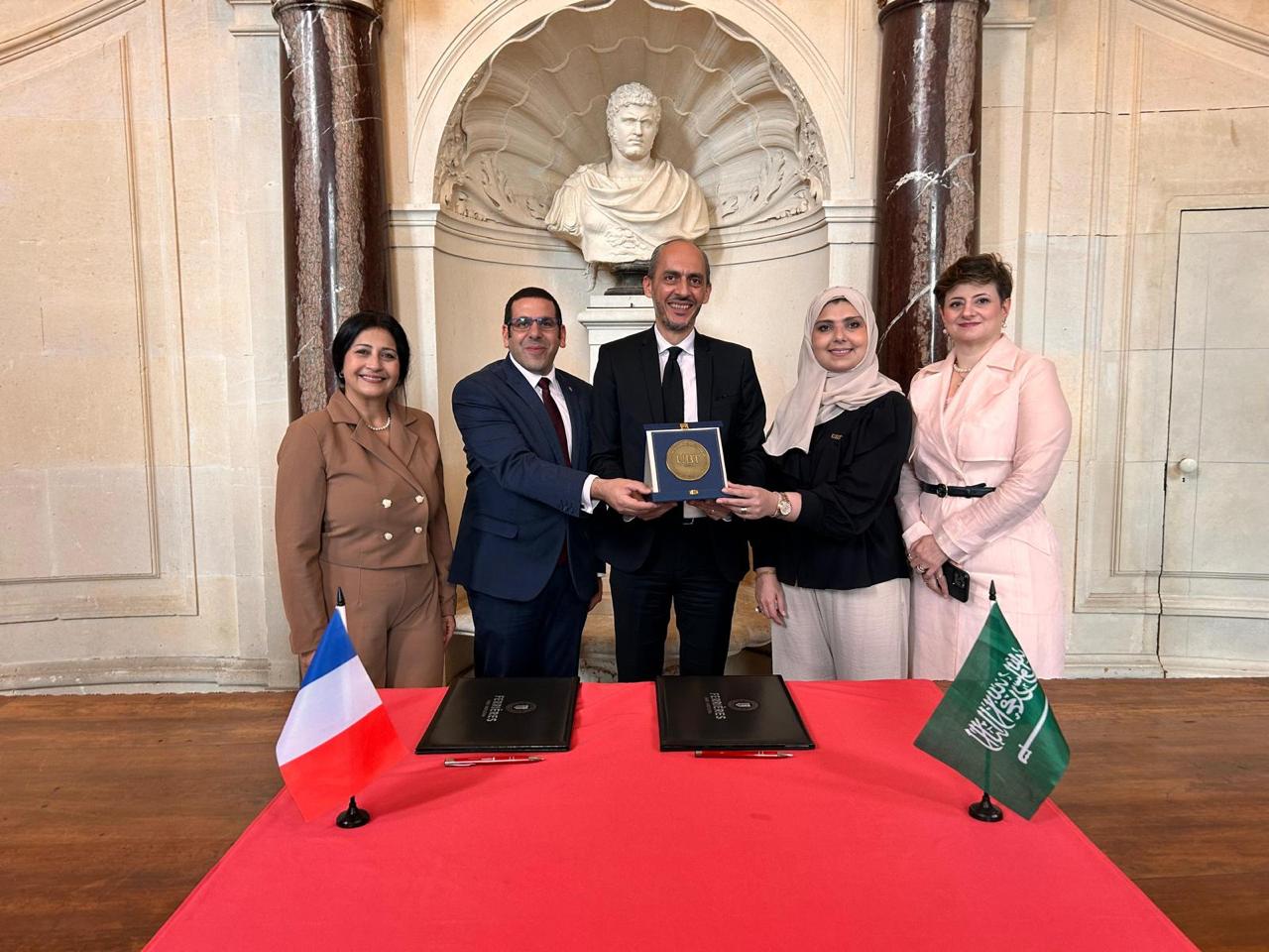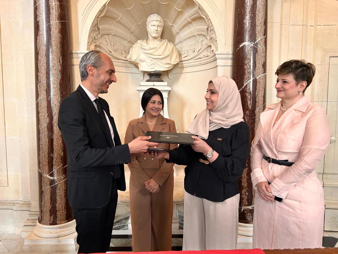 وقد تم توقيع الاتفاقية ، اليوم ، في مقر الجامعة في باريس "قصر نابليون"، أحد المعالم التاريخية البارزة في العاصمة الفرنسية، حيث ترأست وفد الجامعة الدكتورة رمزية البكري، مساعد رئيس الجامعة لشؤون الطالبات وعميدة كلية إدارة الأعمال، بمشاركة كل من الدكتورة بسمة الزين، مسؤولة وادي التقنية، والبروفيسورة حنان جودة، مسؤولة العلاقات الدولية، حضور رسمي يعكس اهتمام الجامعة بتوسيع آفاق التعاون الدولي والارتقاء بجودة التعليم.