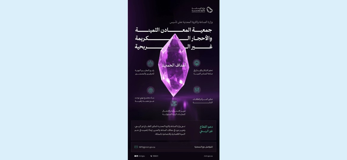 يأتي ذلك في إطار جهود الوزارة لتمكين المنظمات غير الربحية في قطاعي الصناعة والتعدين، إيمانًا بدورها في دعم التنمية الاقتصادية والاجتماعية بالمملكة، حيث تواكب الأهداف الإستراتيجية للجمعية، مستهدفات رؤية المملكة 2030، ومنها تنمية المحتوى المحلي من منتجات الأحجار الكريمة والمعادن الثمينة، ودعم الصناعات الإبداعية، وتمكين المرأة والطاقات الشابة، ورفع المعايير المهنية للمصممين عبر برامج تدريبية وورش عمل وشهادات احترافية، وتمكين الحرفيين والمصممين السعوديين عبر دعم فني ومالي ومنح إنتاج وتعزيز حضورهم في المعارض المتخصصة محليًا ودوليًا.
