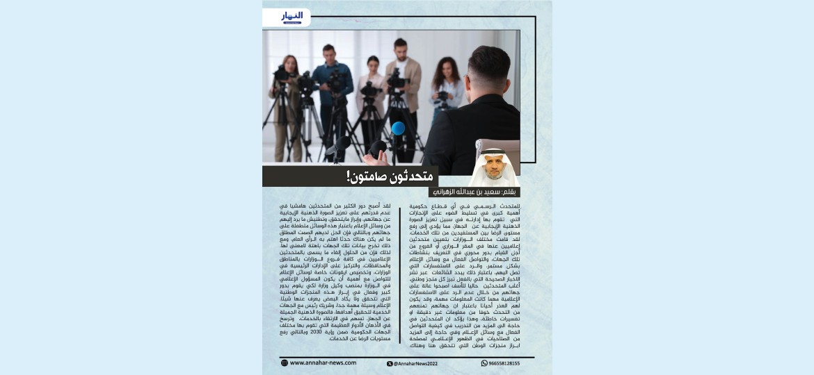 أغلب المتحدثين حاليا للأسف اصبحوا عالة على جهاتهم من خلال عدم الرد على الاستفسارات الإعلامية مهما كانت المعلومات مهمة، وقد يكون لهم العذر أحيانا باعتبار ان جهاتهم تمنعهم من التحدث خوفا من معلومات غير دقيقة او تفسيرات خاطئة، وهذا يؤكد ان المتحدثين في حاجة الى المزيد من التدريب في كيفية التواصل الفعال مع وسائل الإعلام وفي حاجة إلى المزيد من الصلاحيات في الظهور الإعلامي لمصلحة ابراز منجزات الوطن التي تتحقق هنا وهناك.