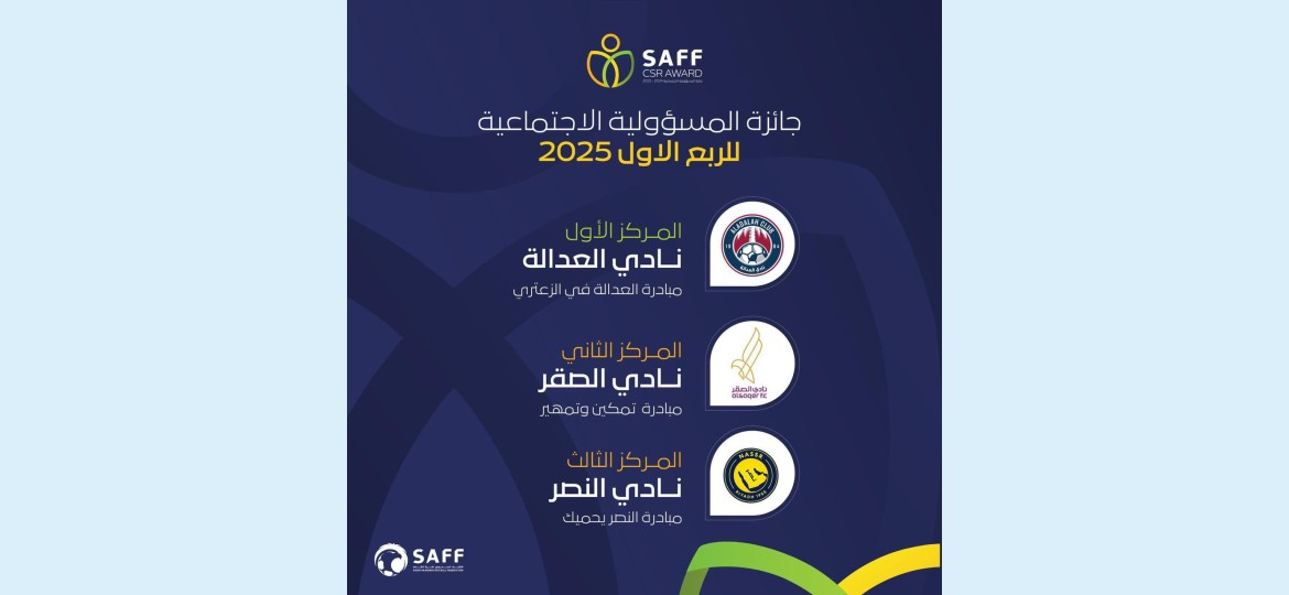 أعلن الاتحاد السعودي لكرة القدم الأندية الفائزة في جائزة المسؤولية الاجتماعية للأندية عن الربعين الأول والثاني للعام 2025 حيث حقق نادي العدالة المركز الأول عن الربع الأول، من خلال مبادرته "العدالة في الزعتري".