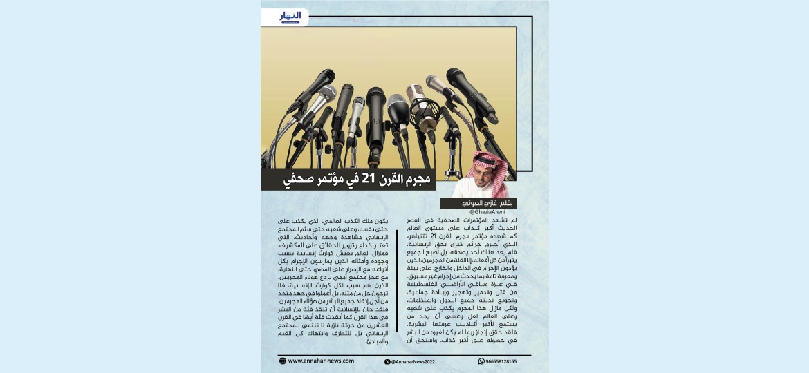 لم تشهد المؤتمرات الصحفية في العصر الحديث أكبر كذاب على مستوى العالم كم شهده مؤتمر مجرم القرن 21 نتنياهو، الذي أجرم جرائم كبرى بحق الإنسانية.